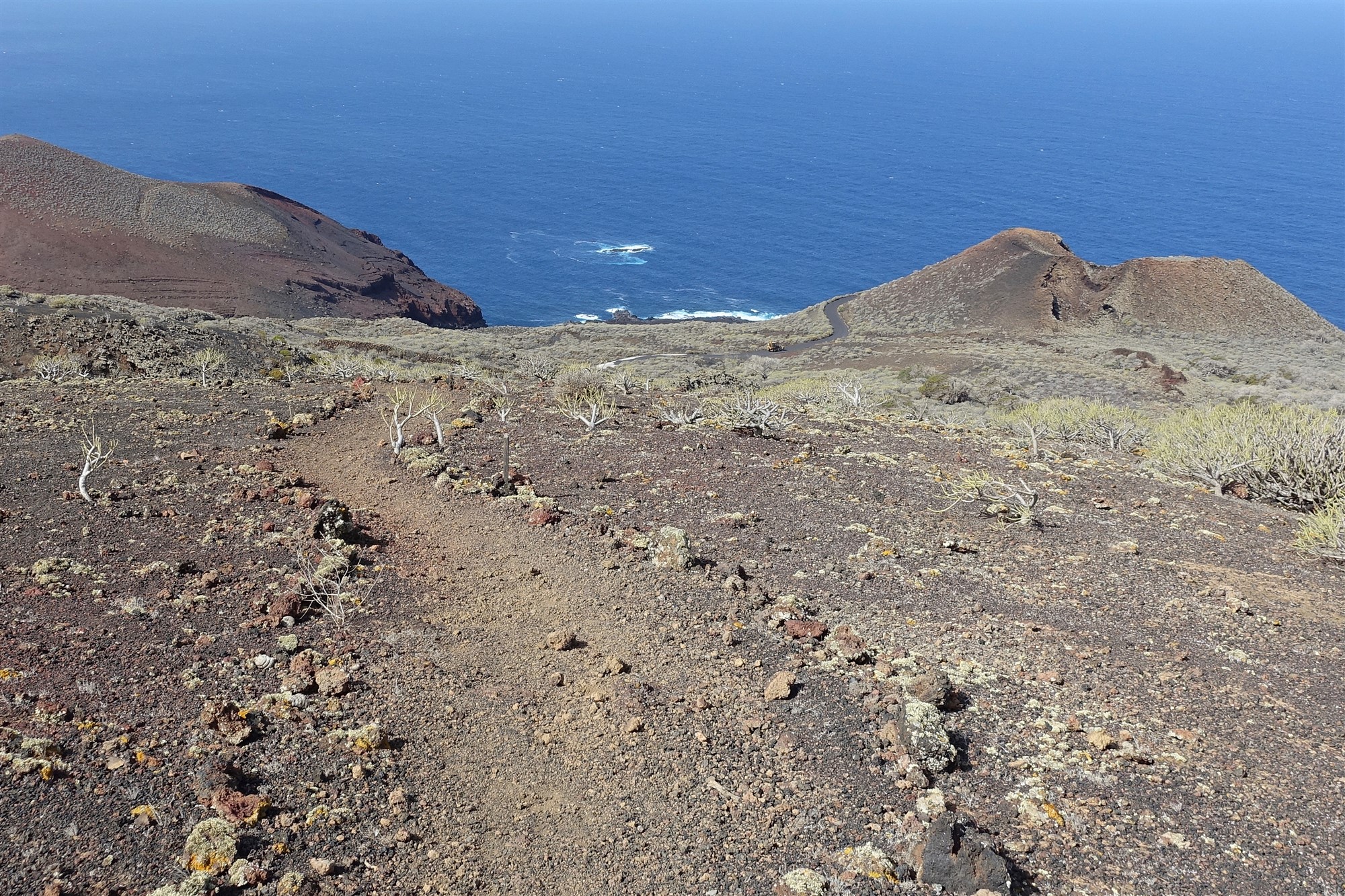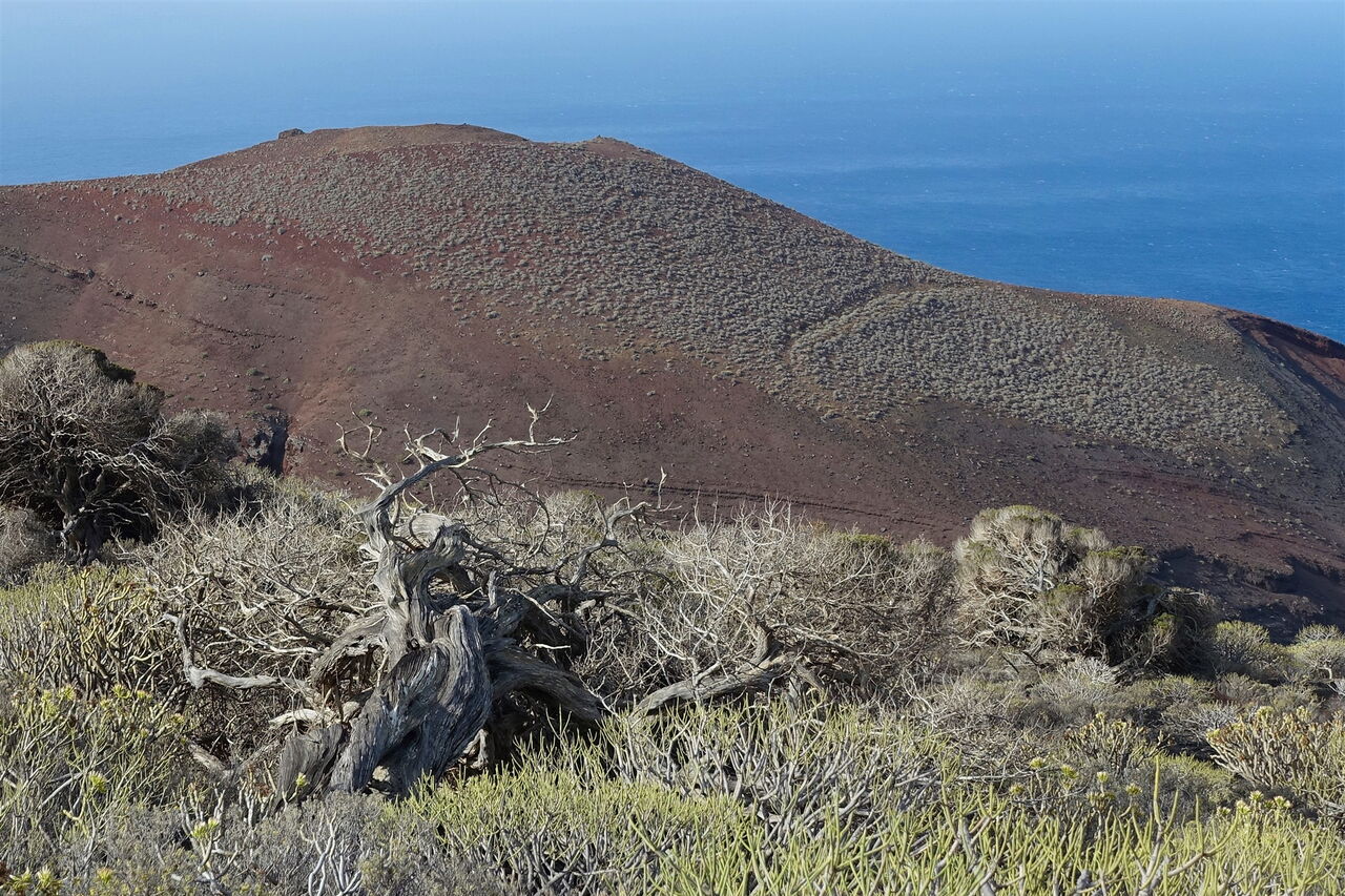 Das Landschaftsbild auf der Wanderung durch die atemberaubende Vulkanlandschaft ist geprägt vom tiefen Schwarz des Vulkangesteins, verschiedensten rötlichen Tönen der Felswände und einem großen gelblichen Felsen – allesamt Folgen unterschiedlichster vulkanischer Ausbruchsarten. Dazwischen befinden sich die grünen Tupfer von Wolfsmilchgewächsen und den bis auf den Boden gebogenen und knöchrigen Zedernwacholderbäumen. Die schönsten Aussichtspunkte liefert oftmals die Natur selbst.