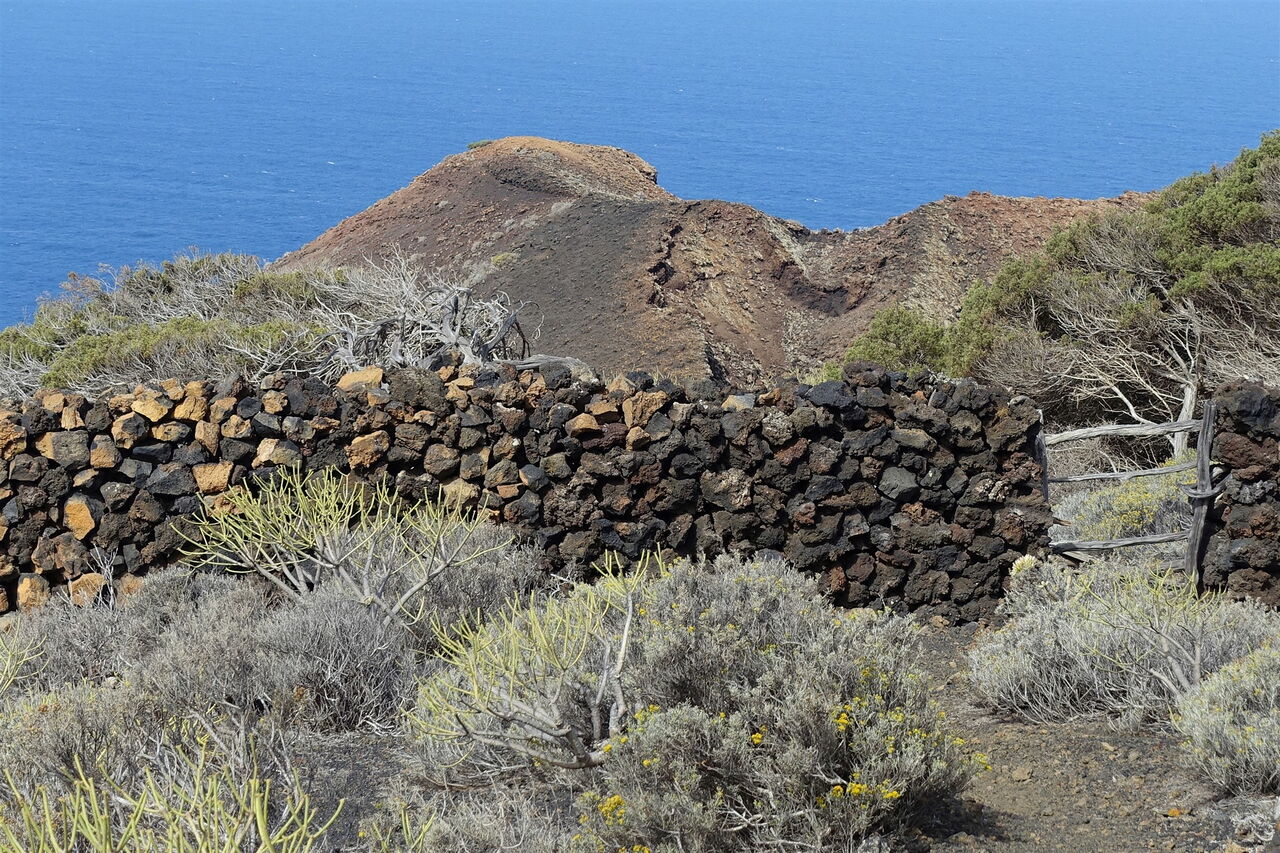 Vom (02) Mirador de Lomo Negro 2 (274 m) sieht man rechts in einem steil abfallenden Felshang einen auffallend gelblich gefärbten Felsen. Er zeugt von einer sogenannten phreatomagmatischen Explosion, bei der das Wasser des Meeres oder des Untergrundes mit dem Magma in Berührung kam. Der intensive gelbliche Farbton entsteht durch die rasche Abkühlung des Magmas. Wir setzen die Wanderung in die eingeschlagene Richtung fort, bis wir an einer Trockensteinmauer entlanggehen.