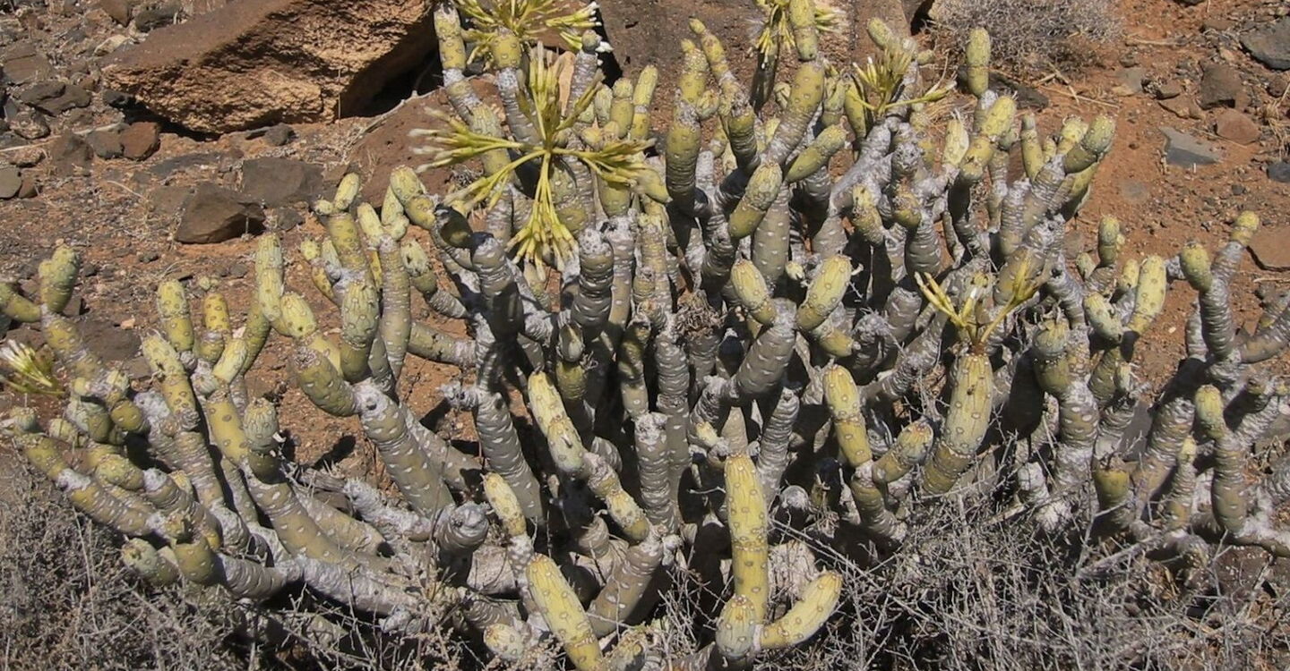 Wir haben jetzt bereits 2,2 km zurückgelegt, das Barranco ist sehr eng und steinig geworden. Sobald wir in dieser kargen Gegend auf Höhe der oberhalb wachsenden Wolfsmilchgewächse angekommen sind, steigen wir nach weiteren 700 m weglos aus dem (03) Barranco (233 m) und wechseln auf die Asphaltstraße. Dieser folgen wir bis zum Ende bei der Degollada de los Canarios. Das erste Etappenziel ist erreicht und wir werden mit einem grandiosen Blick auf die 350 Höhenmeter tiefer liegende Küste belohnt.