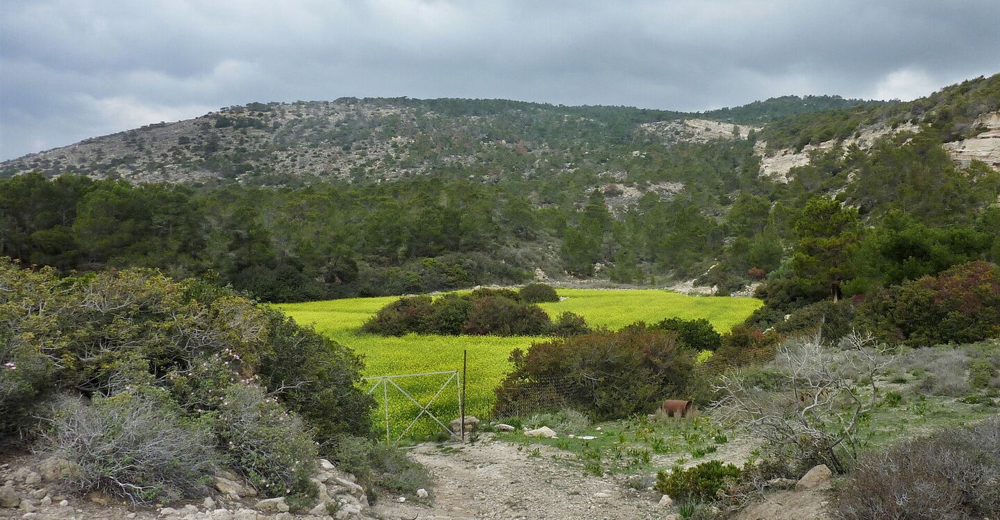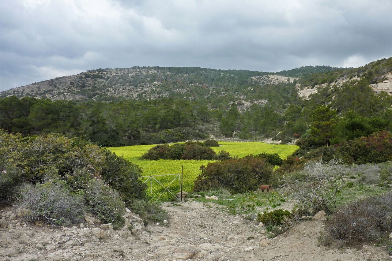 Vor einem Olivenhain treffen wir auf eine (02) Weggabelung (240 m), hier gehen wir links und nach 40 m sofort rechts, an den Weinreben vorbei und auf ein Waldstück zu. Nach einem Ziegengatter führt ein Pfad über einen Bergrücken bergab. Steinmännchen helfen bei der Orientierung durch die flach gewachsenen Sträucher und die Felsen.
