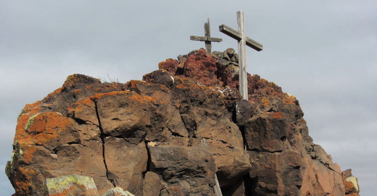 Es folgt ein weiteres Stück mit mäßiger Steigung, bevor der endgültige Anstieg bis zur (05) Montana Areguia (492 m) beginnt. Das Gipfelkreuz liegt etwas erhöht auf einem Basaltsteinkomplex. Die Aussicht unterhalb des Gipfelkreuzes ist einfach gigantisch. Der Blick von hier oben ist atemberaubend. Man schaut auf die wilde Westküste von Fuerteventura, weiter links erkennt man an den Sandfarben die Dünenlandschaft des Jandia-Nationalparks und am Horizont erheben sich die südlichsten Gipfel der Insel.
