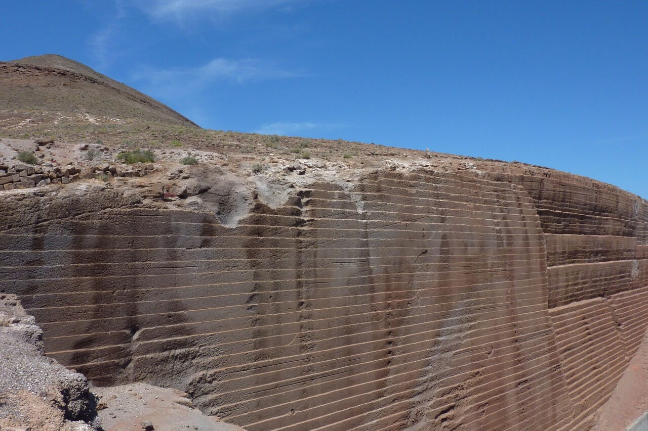 Kurz hintereinander folgen zwei Weggablungen. Bei der ersten gehen wir links und bei der zweiten rechts. Der Weg führt nun leicht bergauf, vorbei an bis zu 20 m hohen Wänden aus dunklem, feinkörnigem Eruptionsgestein. Wir wandern nun stetig bergauf, ignorieren einen Abzweiger nach links und einen nach rechts und gehen nun direkt am Fuße der Montaña de Guenia, bis wir die (04) Schlüsselstelle (251 m) erreichen. Die Steigung der Schotterpiste ist geringer geworden und links vom Hauptweg zweigt eine weitere Piste ab. Rechts von uns, im Hang, ist die Erde abgerutscht, wodurch ein 40 × 50 m großes Loch entstanden ist.