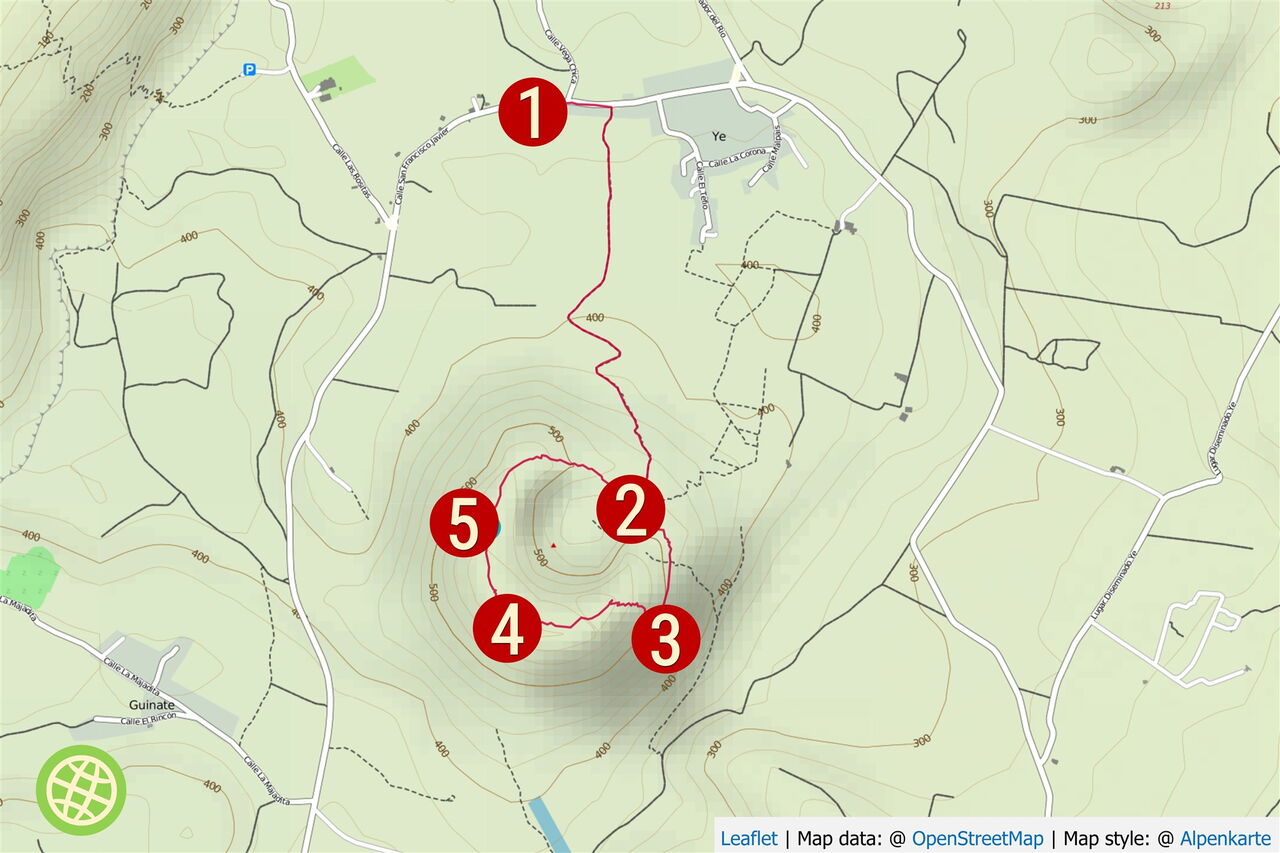 Über einen Wirtschaftsweg erreicht man schnell den untersten Kraterrand. Auf der folgenden Kraterrandumrundung gibt es immer wieder steile, steinige und rutschige Abschnitte. Die Orientierung ist jedoch immer eindeutig - selbst bei Nebel -, da es stets am Krater entlanggeht. Untergrund: 30% angelegter Weg aus Lavagranulat und 70% Lavasteine in verschiedenen Größen. Ausrüstungsempfehlung: Wanderstöcke für den steilen, rutschigen Auf- und Abstieg. Einkehr: Restaurant Volcan de la Corona in Yé. Die Strecke kann das ganze Jahr über begangen werden. In den Wintermonaten ist mit erhöhter Wolkenbildung zu rechnen. Mit dieser Wanderung lässt sich perfekt die Besichtigung einer der Top-Sehenswürdigkeiten auf Lanzarote kombinieren, des Mirador de Rio.