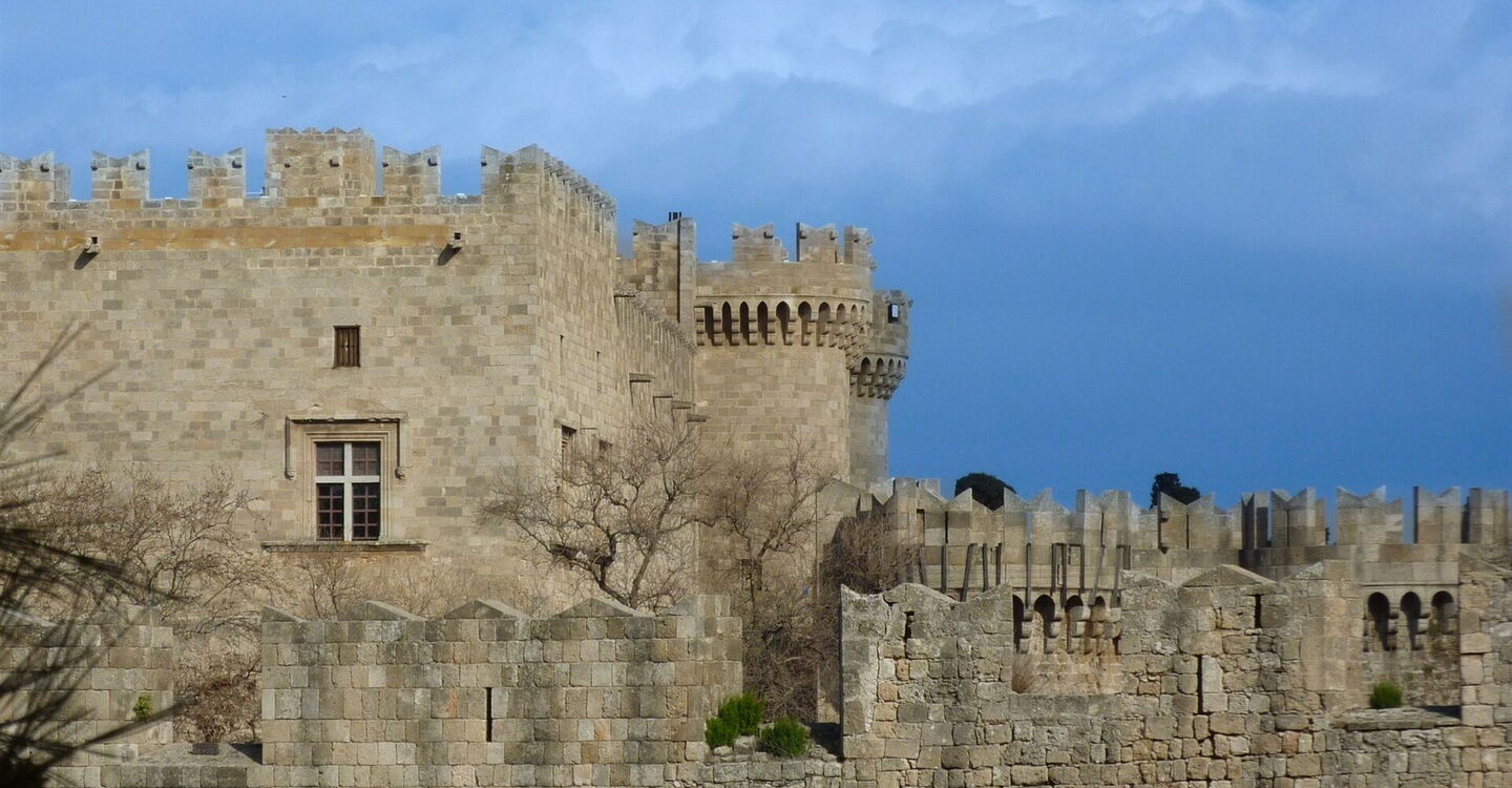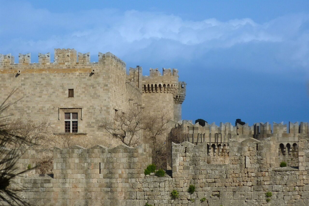 Vom (01) Start und Ziel bei der Akropolis (43 m) gehen wir links auf der Anfahrtsstraße, lassen den Busparkplatz rechts liegen und queren geradeaus die Kreuzung am Stoppschild. Nach 200 m endet diese Straße, auf der gegenüberliegenden Straßenseite befindet sich eine Ruine, hier gehen wir links Richtung Stadtmitte. Wir erreichen ein kleines bewaldetes Stück mit einer grünen Verkehrsinsel, hier halten wir uns halb links und erreichen eine zweite begrünte Verkehrsinsel. Beim Kinderspielplatz und den Cafés gehen wir rechts in die Straße, überqueren die Hauptstraße – rechts durch die Bäume kann man den Großmeisterpalast ausmachen – und gehen nun zunächst zwischen Hauptstraße und Burggraben.