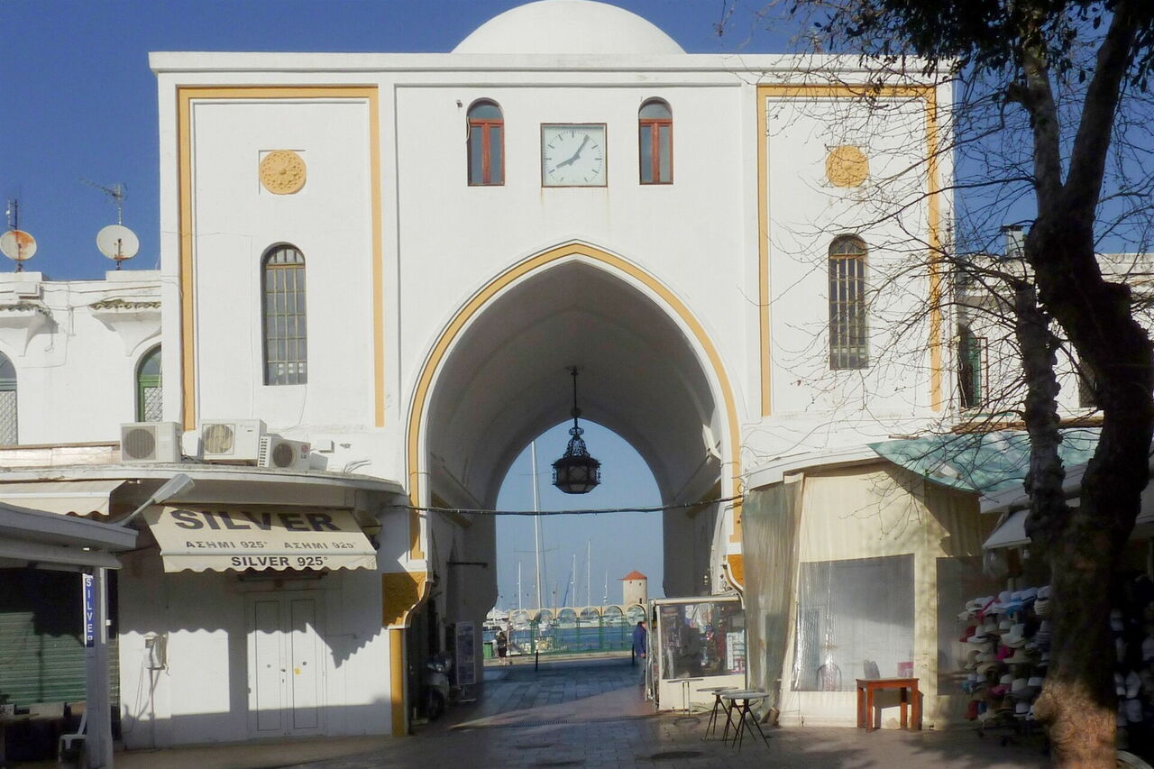 Sobald wir halb links auf der anderen Straßenseite Kuppeln sehen – sie vermitteln eher das Erscheinungsbild einer prächtigen Moschee aus der Zeit der türkischen Herrschaft –, gehen wir durch den Haupteingang in den (02) Neuen Markt – Nea Agora (3 m). In unmittelbarer Nähe der mittelalterlichen Stadt, am Mandrakihafen gelegen, haben die Italiener einen Marktplatz errichtet. In der hofartigen Anlage mit einem markanten Pavillon in der Mitte, unzähligen Ständen und Geschäften, Cafés, Tavernen und Restaurants tummeln sich Einheimische und Touristen.