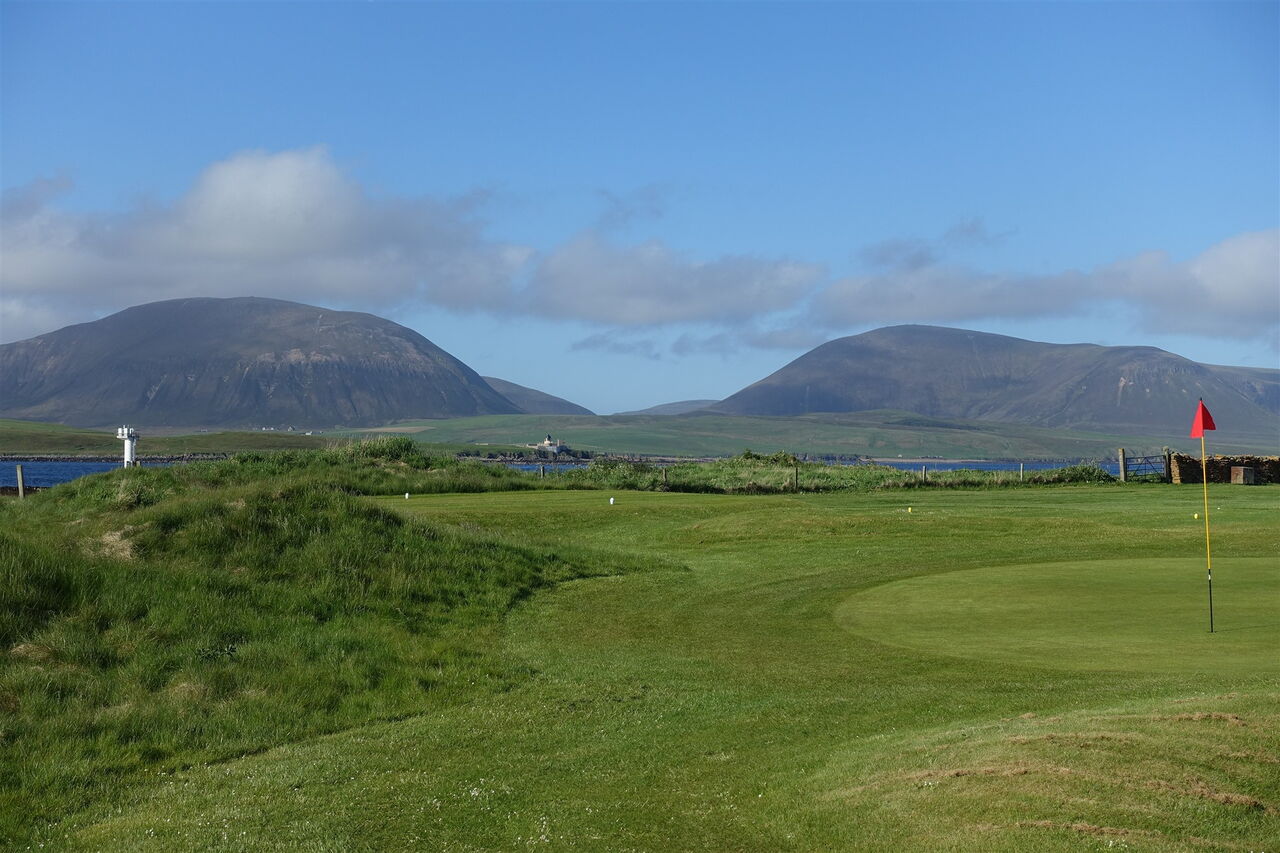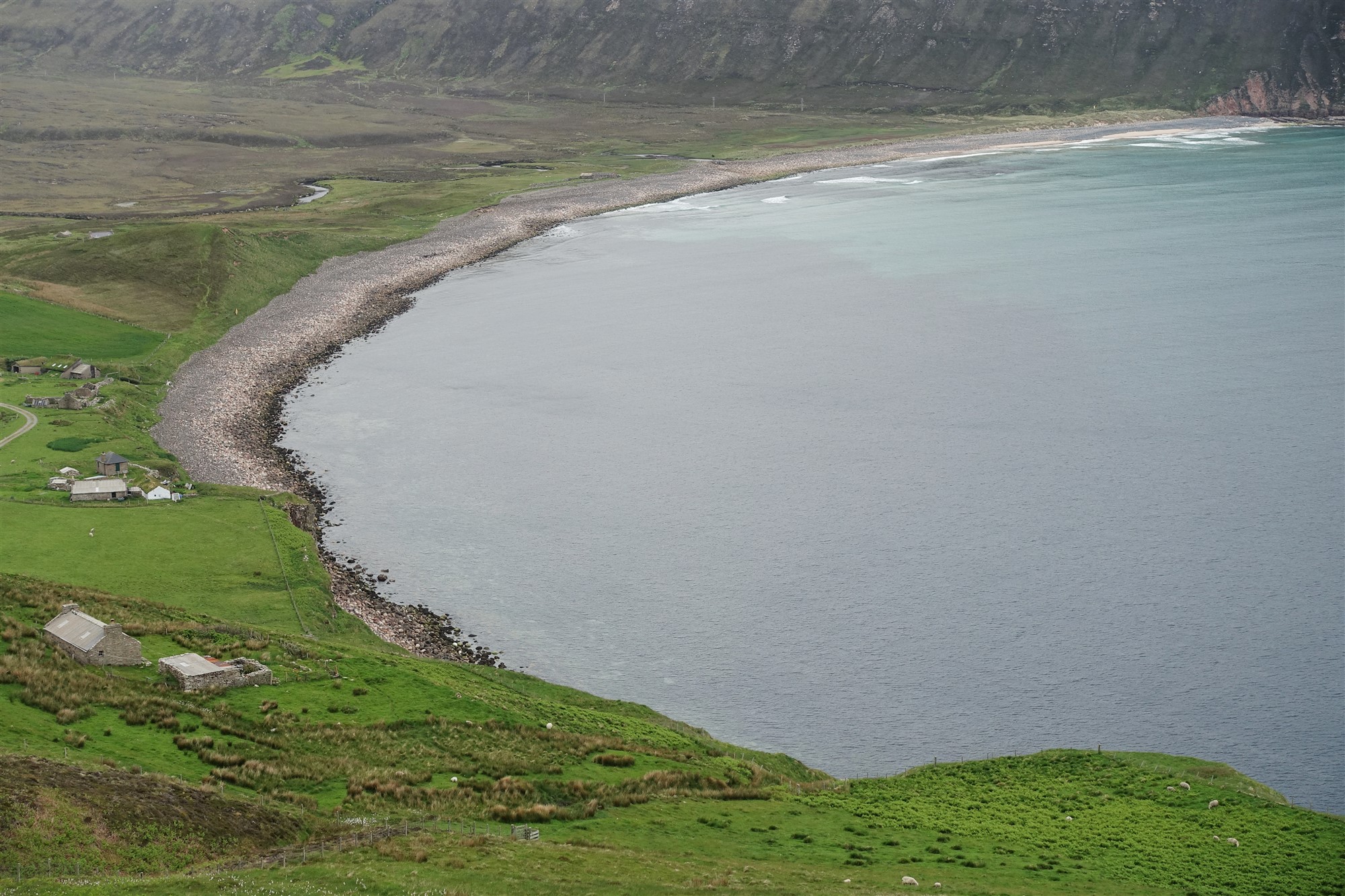 Nachdem wir ein gutes Stück vorangekommen sind, sehen wir rechts unterhalb die Bucht mit dem 05 Rackwick Beach (134 m). Wir gehen in Richtung einzelner Häuser im Landesinneren und nicht rechts bergab. Sobald wir die Straße erreicht haben, gibt es die Möglichkeit – wie in der Variante beschrieben –, mit einem Shuttlebus zurückzufahren. Die Straße mündet in eine weitere Straße und direkt hinter einer kleinen Brücke biegen wir links auf den angelegten Pfad ab. Dieser zieht sich durch ein Tal zwischen dem links liegenden Berg Cuilag und dem mit 479 m höchsten Berg der Insel, dem Ward Hill. Am Ende des Weges erreichen wir den gestauten See und gehen auf dem bekannten Hinweg zurück zum Fähranleger.