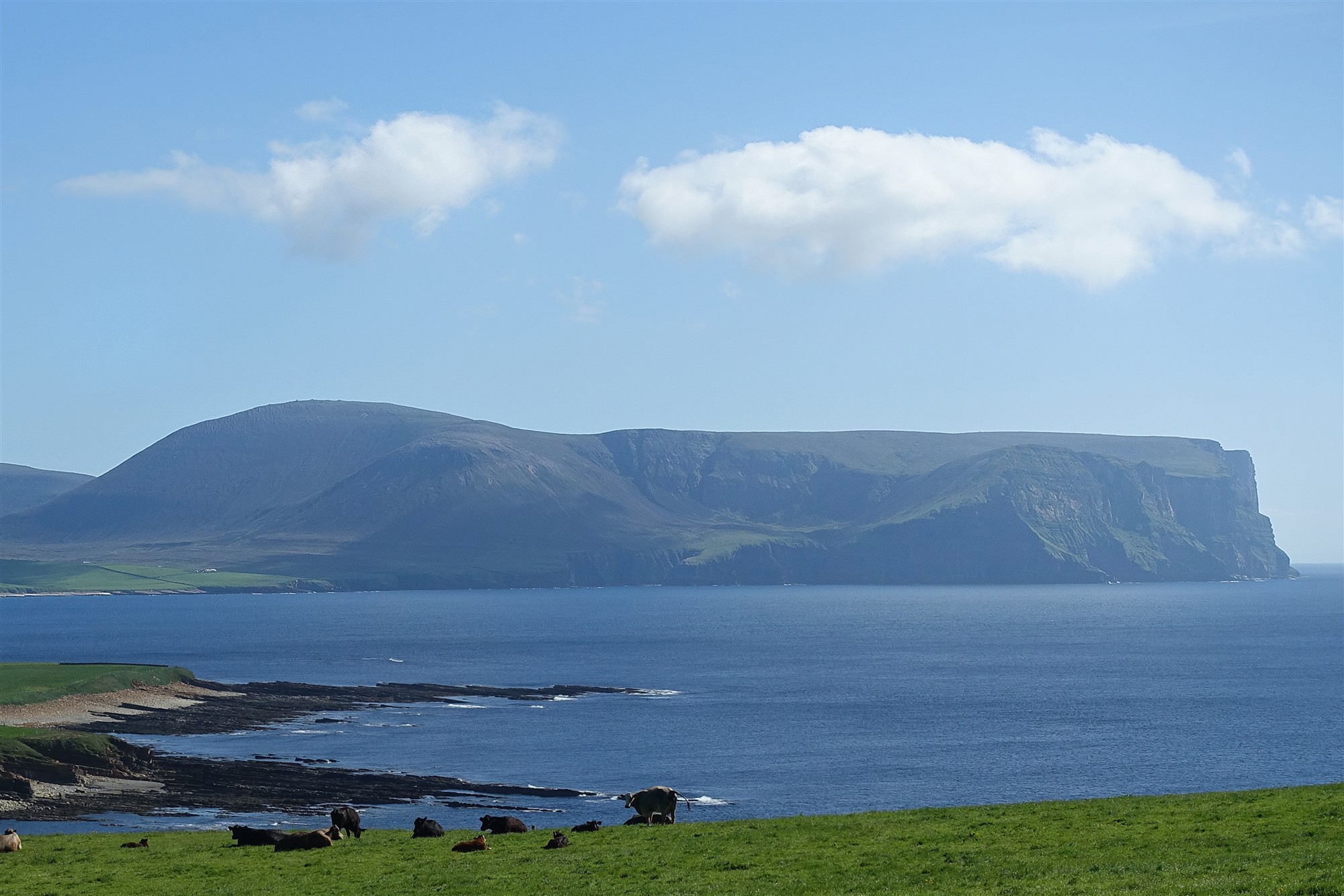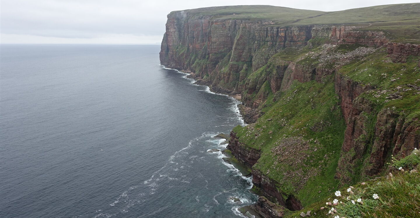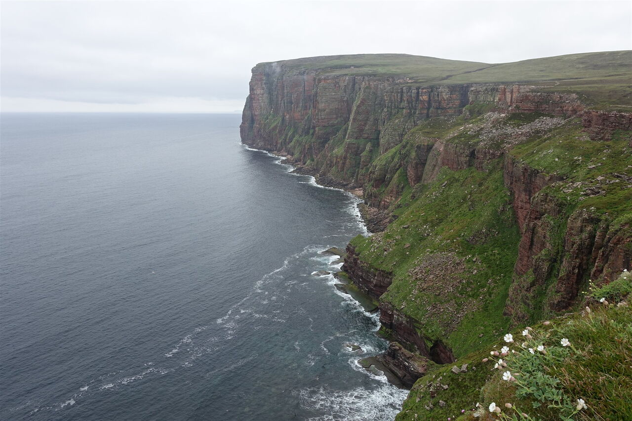 Wir erreichen einen Betonsockel. Ab diesem Messpunkt ist wieder ein schmaler Trampelpfad auszumachen. Bei aufgestellten Steinplatten beginnen wir nun halb rechts mit dem Abstieg über die Almwiesen Schottlands. Wir erreichen den oberen Klippenrand, beim Blick auf das 332 m tiefer gelegene Meer stockt automatisch der Atem. Vor uns thront das 03 St John's Head (332 m), mit 343 m ist es die am steilsten abfallende Klippe Großbritanniens. 1970 wurde sie erstmals bestiegen. Von nun an folgen wir dem Küstenpfad bis zur Laeden Geo. Eine an ihrer engsten Stelle 3–5 m breite Rinne fällt aus 328 m Höhe steil bis zum Meer ab, mittig hat sich dekorativ ein großer Stein verkeilt.