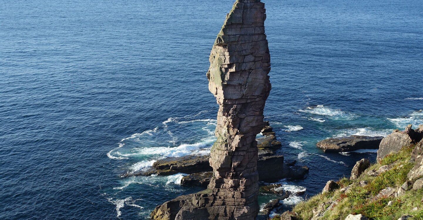 Auf dem Küstenpfad steigen wir noch ein kurzes Stück auf, um dann steil abzusteigen und die Grasfläche oberhalb des 03 Old Man of Stoer (67 m) zu erreichen. Die Erstbesteigung der Felsspitze geht an Dr. Tom Patey. Noch schwieriger als die Besteigung ist es wohl, durch das ungestüme Meer an den Sockel der Felsspitze zu gelangen.