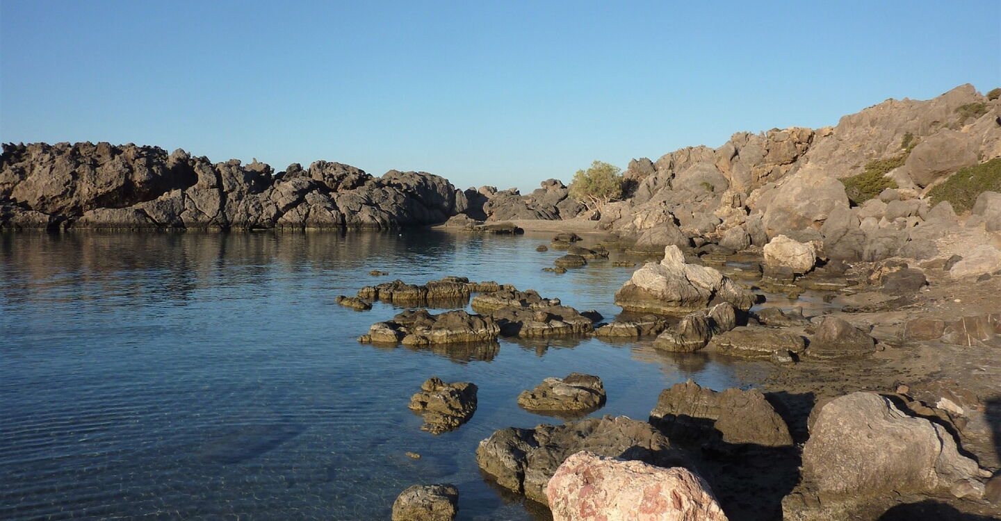 Wir gehen bis an das Ende der Bucht und klettern über einen Felsen, um in die nächste Bucht zu gelangen. Bei einem E4-Markierungspfeiler beginnen wir den 175 m langen Aufstieg zur oberhalb liegenden Schotterpiste. Nach weiteren 500 m haben wir die Anhöhe überquert und verlassen die Piste auf einen bergab führenden Pfad zum 03 Krios-See (1 m). Er befindet sich in einer wunderschönen geschützten Bucht. Zwischen vielen felsigen Stellen gibt es immer wieder kleine sandige Strandabschnitte. Hier befanden sich die altertümliche Stadt Vienna und ein Tempel – Reste davon liegen am Ufer verstreut oder man kann sie beim Schnorcheln entdecken.