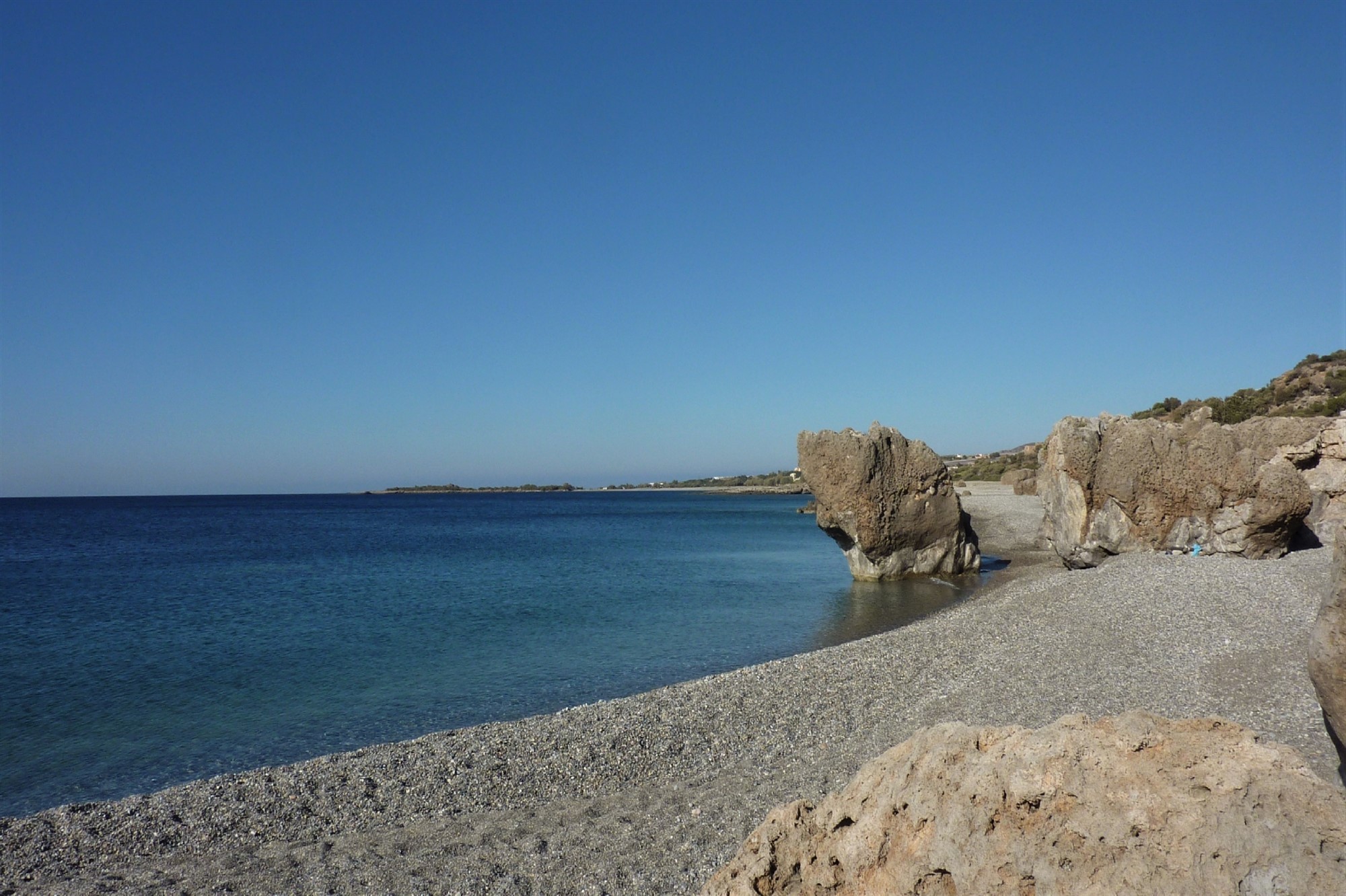Von dem kleinen, reizvollen Dorf 01 Paleochora (2 m), dessen Spitzname Brücke nach Libyen ist, gehen wir über den Sandstrand in westliche Richtung. Am Ende des Strandabschnitts gelangen wir an felsige Stellen – aber immer noch schöner, als auf der Hauptstraße zu gehen.