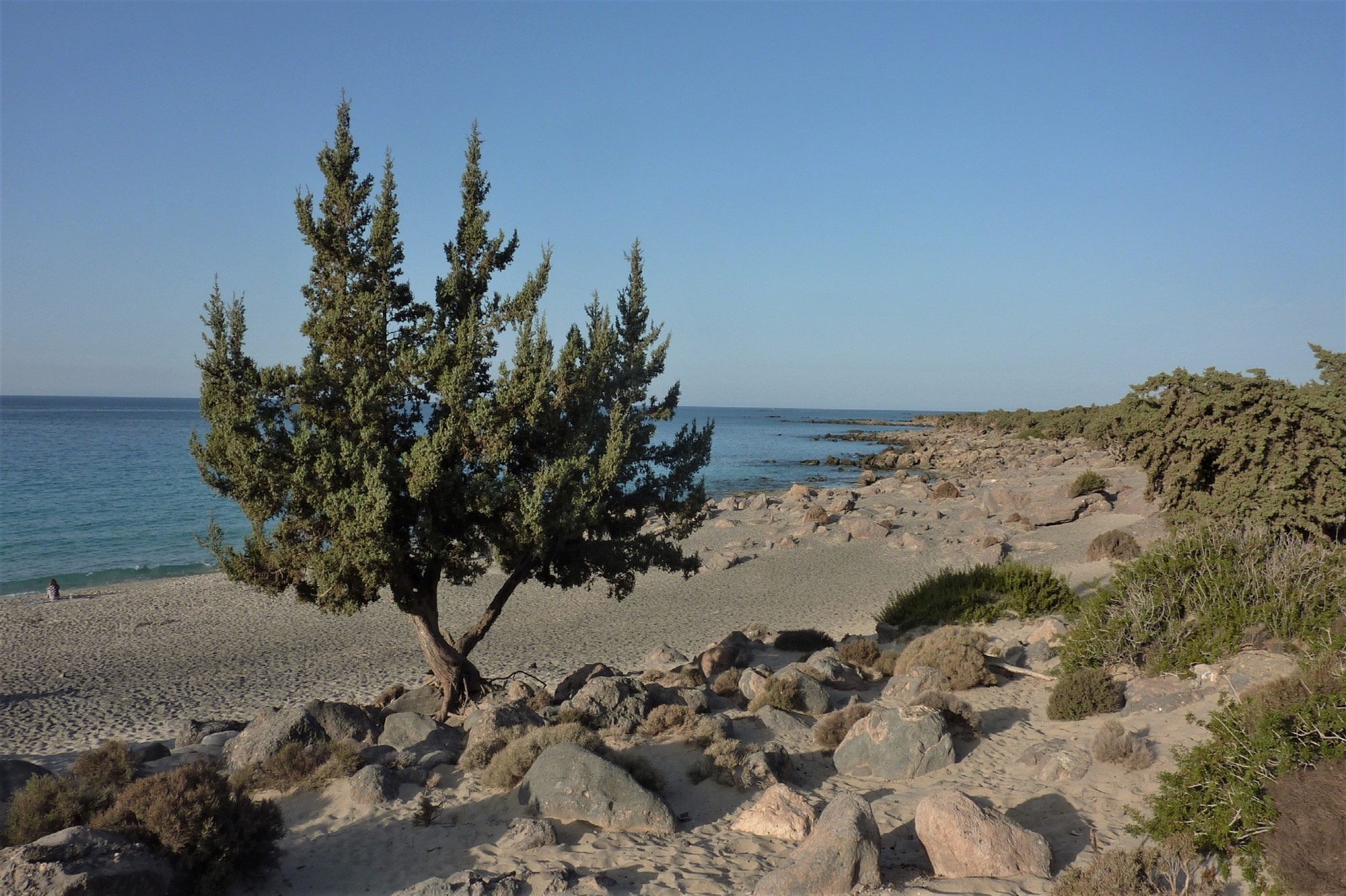Wir gehen zunächst 70 m auf dem Uferpfad zurück, um dann scharf links auf einem gut auszumachenden Pfad aufzusteigen. Bei der nachfolgenden Anhöhe werden wir mit einem faszinierenden Fernblick auf die Halbinsel Elafonisi belohnt. Immer auf gleichem Höhenniveau queren wir den Hang und erreichen die auf einem Hügel stehende Kapelle Agios Ioannis. Nun kontinuierlich bergab erreichen wir einen weiteren wunderschönen Strandabschnitt. Der Weg steigt wieder an und wir queren eine kleine Schlucht. Obacht! Hier gehen wir nicht geradeaus weiter, sondern links oberhalb der Schlucht 140 m bergab, um dann rechts über Felsen den wildromantischen 04 Kedrodasos-Strand (1 m) zu erreichen. Sanddünen aus nahezu weißem Sand und uralte Zedern verzaubern den Betrachter.