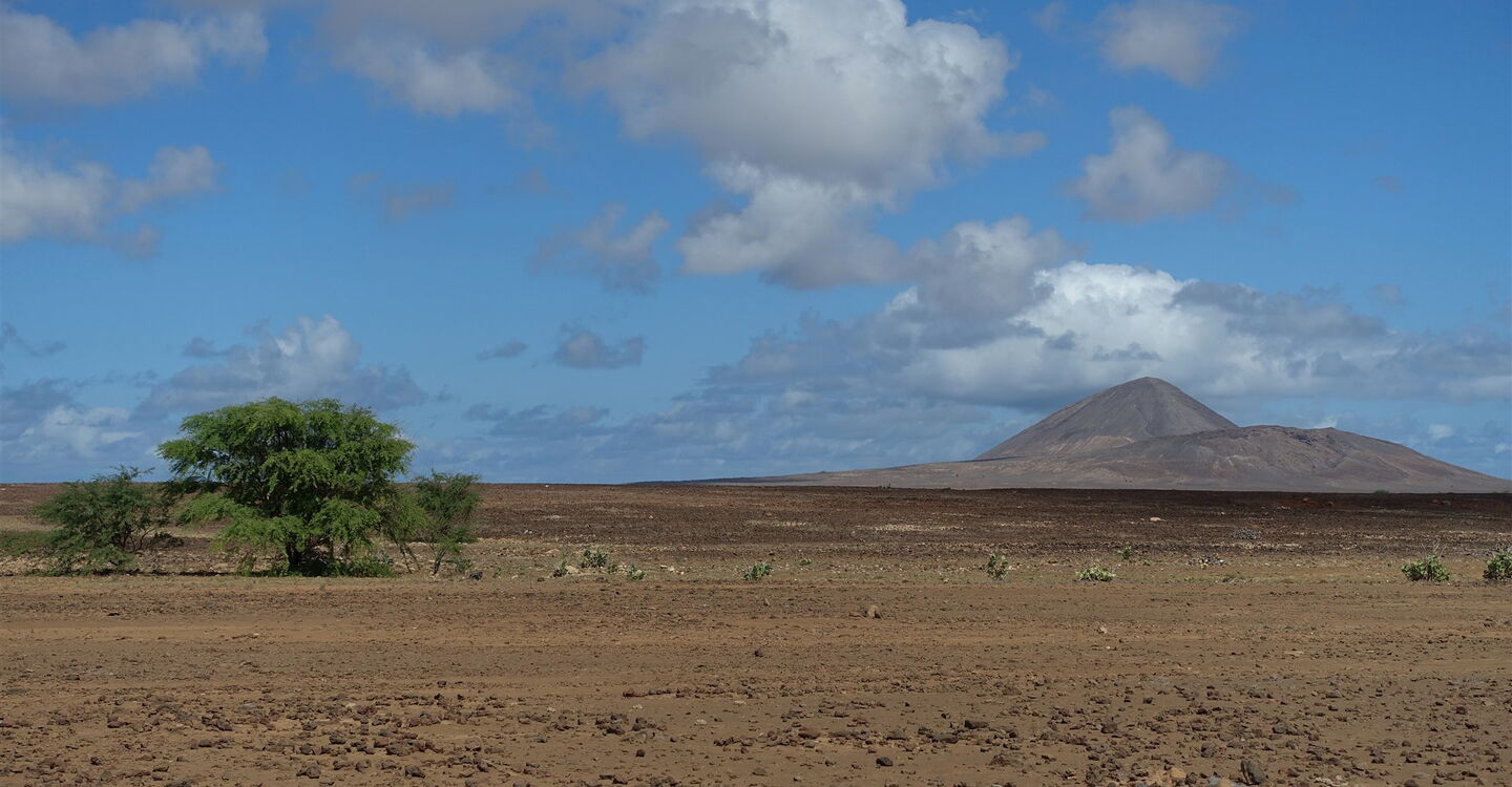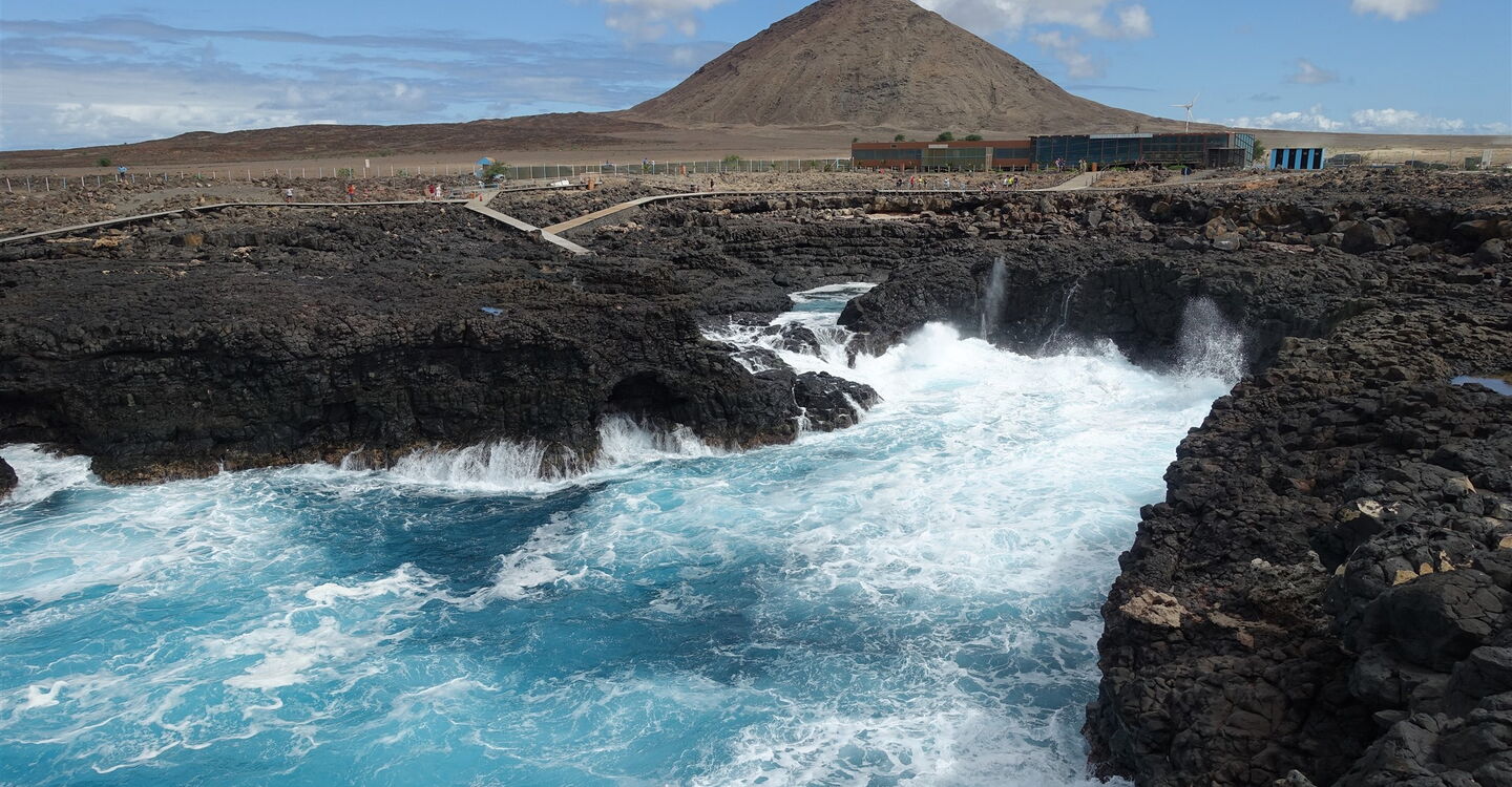 Entlang der Westküste von Sal, mit seinen einzigartigen geologischen Besonderheiten, führt die Wanderung zu einer der interessantesten Sehenswürdigkeiten der Insel. Im Meeresarm von Buracona, deren Felsen aus Basalt sind, befindet sich das Olho Azul. Bei perfekten Bedingungen reflektiert der Lichteinfall des Sonnenlichts, am Meeresgrund der Bucht, in Form eines riesigen blauen Auges. Zu den idealen Voraussetzungen zählen: Mäßiger Wellengang, wenn man um die Mittagszeit an Ort und Stelle ist und die Sonne genügend hoch am Himmel steht. Grüne Algen, die sich angesiedelt haben, und das blaue Auge, stehen im Kontrast zur umliegenden schwarzen Vulkanlandschaft. Auf dem Rückweg marschieren wir durch die karge Savanne, vorbei am Fuße des 269 m hohen Vulkan Monte Leste bis zur Inselhauptstadt Espargos.