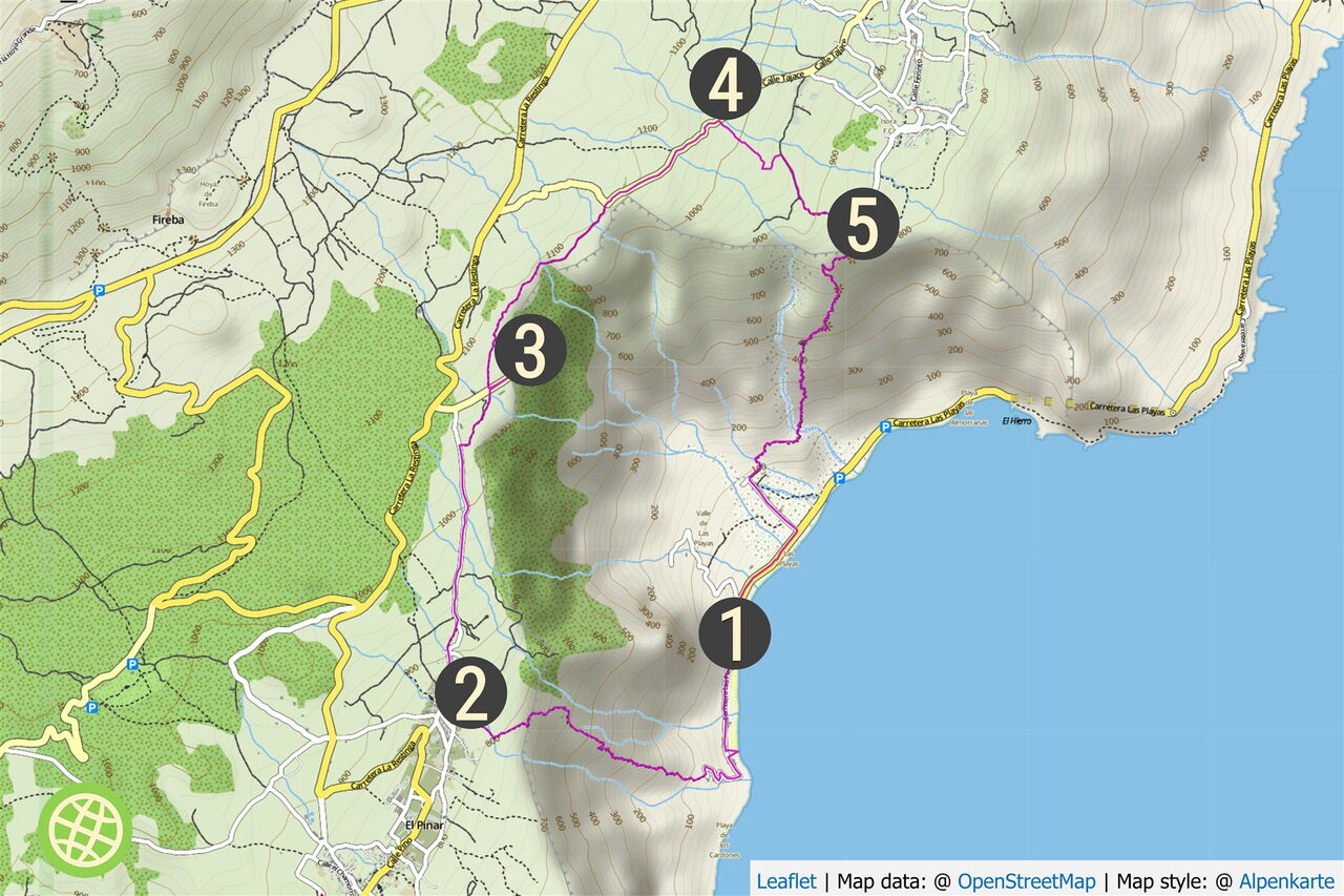 Busverbindung: Line 7, 8:00 Uhr Bus von Valverde zum Parador. Zurück: 18:00 Uhr. Pkw-Anfahrt: Der Ausgangspunkt der Wanderung liegt an der Ostküste in Las Playas, 18 km entfernt von Valverde. Man fährt auf der Straße HI-2 bis zum großen Hotelparkplatz am Parador. Geokoordinaten: 27.717317 -17.958683.