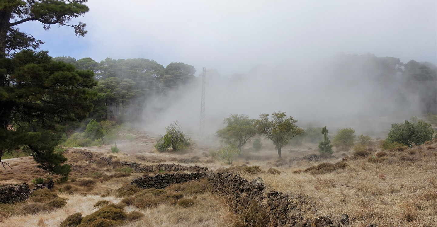 Hier folgen wir rechts der Ausschilderung Richtung Las Playa, bis wir auf die querende Straße zum (03) Mirador de Las Playas (1066 m) treffen – einer der beeindruckendsten Miradors auf El Hierro. Nach der Besichtigung gehen wir ein kurzes Stück auf dem Hinweg zurück. An der Stelle, wo wir auf die Straße getroffen sind, gehen wir rechts auf dem Pfad weiter. Der folgende Wegabschnitt führt immer am Abgrund entlang. 1100 m über dem Meeresspiegel ergeben sich immer wieder gigantische Tiefblicke – wenn nicht Passatwolken die Sicht vernebeln. Der Pfad geht in eine Schotterpiste über und mündet nur kurz später in eine Asphaltstraße, auf der wir Richtung Isora bergab wandern.