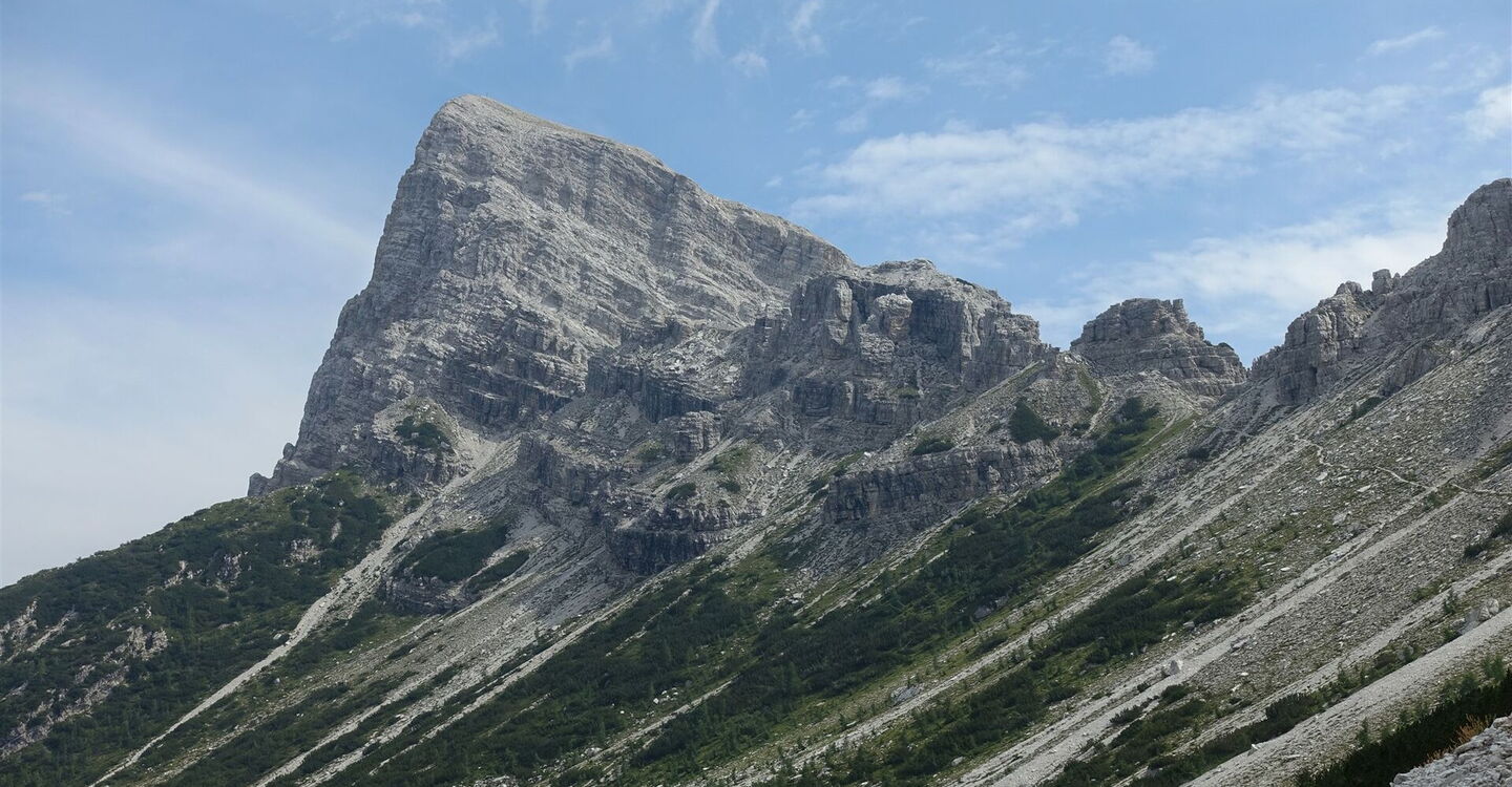 Wir gelangen an eine weitere Wegekreuzung mehrerer 02 Sentieri (1.848 m) und gehen halb links auf der ausgeschilderten Wegnummer 483 nach Ospitale di Cadore. Nur noch ein kurzes Stück gehen wir durch den Wald, dann geht es durch Latschenkiefern und Schutthalden unterhalb des 2.410 m hohen Berges Sfornioi Nord. Wir gehen Richtung Osten, wo sich der schroffe Felsgipfel des 2.413 m hohen Sassolungo di Cibiana auftürmt.