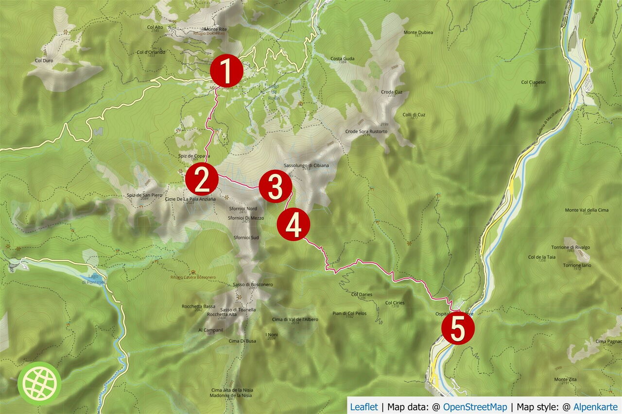 Hinter dem Gebäude der Casera gehen wir rechts und folgen der Schotterpiste durch die lang gezogene Linkskurve. Eine scharf nach links abzweigende Piste ignorieren wir und gehen nun kontinuierlich durch das Valle di Valbona bergab. Bei einer Parkbucht ignorieren wir die nach links abzweigende Stichstraße. Schlüsselstelle: Ca. 325 m hinter einem Haus, oder ca. 15 m vor einer Leitplanke, zweigt nach rechts ein unscheinbarer Pfad ab. Er führt über einen Bergrücken talwärts und endet an einem weiteren Pfad, dem wir rechts bergab bis ins Dorf folgen. Dort gehen wir in Kehren bis zum Unterdorf von 05 Ospitale di Cadore (480 m), um dann auf der Hauptstraße nach links zu gehen und ca. 50 m vor dem Kreisverkehr die Bushaltestelle zu erreichen.