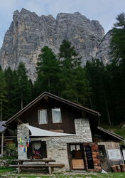 Südwestlich vom Passo Cibiana befindet sich in einer Stichstraße die Unterkunft 01 Baita Deona (1.530 m). Von dort überqueren wir in südlicher Richtung den dazugehörigen Parkplatz und gehen auf der darauffolgenden Forststraße bis zur nächsten Weggabelung. Hier orientieren wir uns nach halb links – Wanderweg 483 – und folgen zunächst der Ausschilderung Richtung Bivacco Campestrin. Wir ignorieren den nachfolgenden halb links abzweigenden Pfad zur Malga Copada Alta und gehen geradeaus weiter.