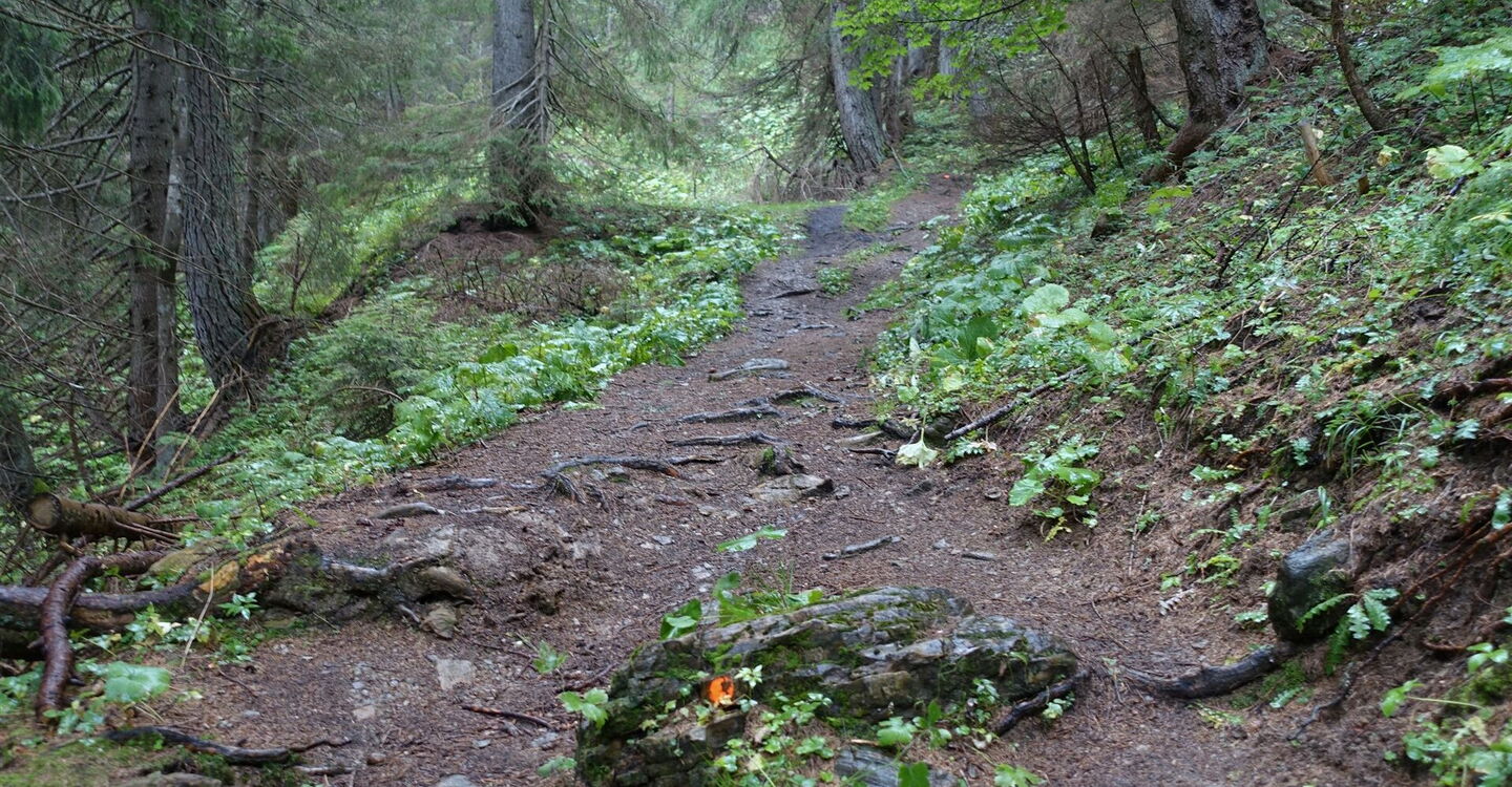 Wir ignorieren alle weiteren Abzweiger und erreichen die Einsattelung 03 Le Calades (1.858 m). Nach ca. 30–50 m Entfernung folgen wir dem linken Abzweiger Richtung Rifugio Bosconero und nicht dem weiterführenden Pfad Richtung Baita Darè Copàda und Spiz de San Piero. Zum Zeitpunkt der Recherchereise befanden sich dort kein Wegweiser und keine Wegnummer.