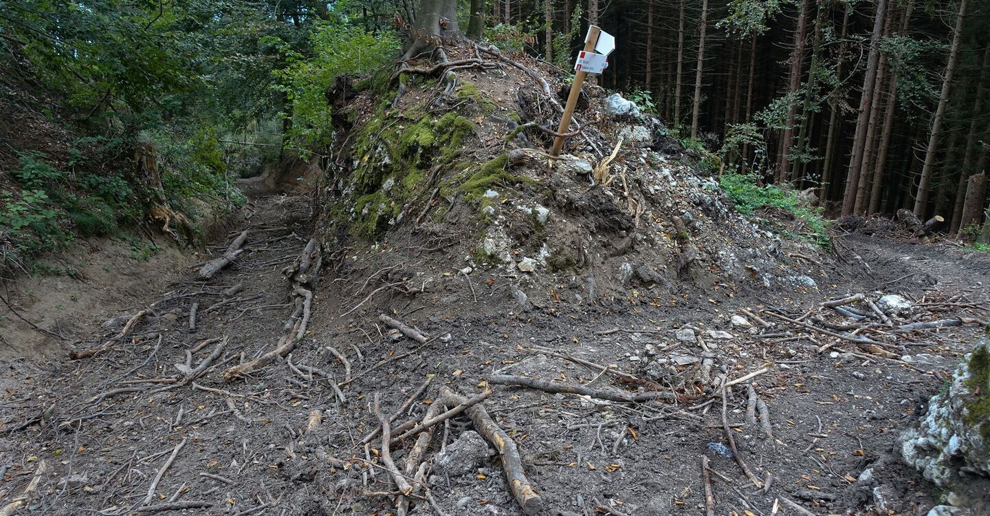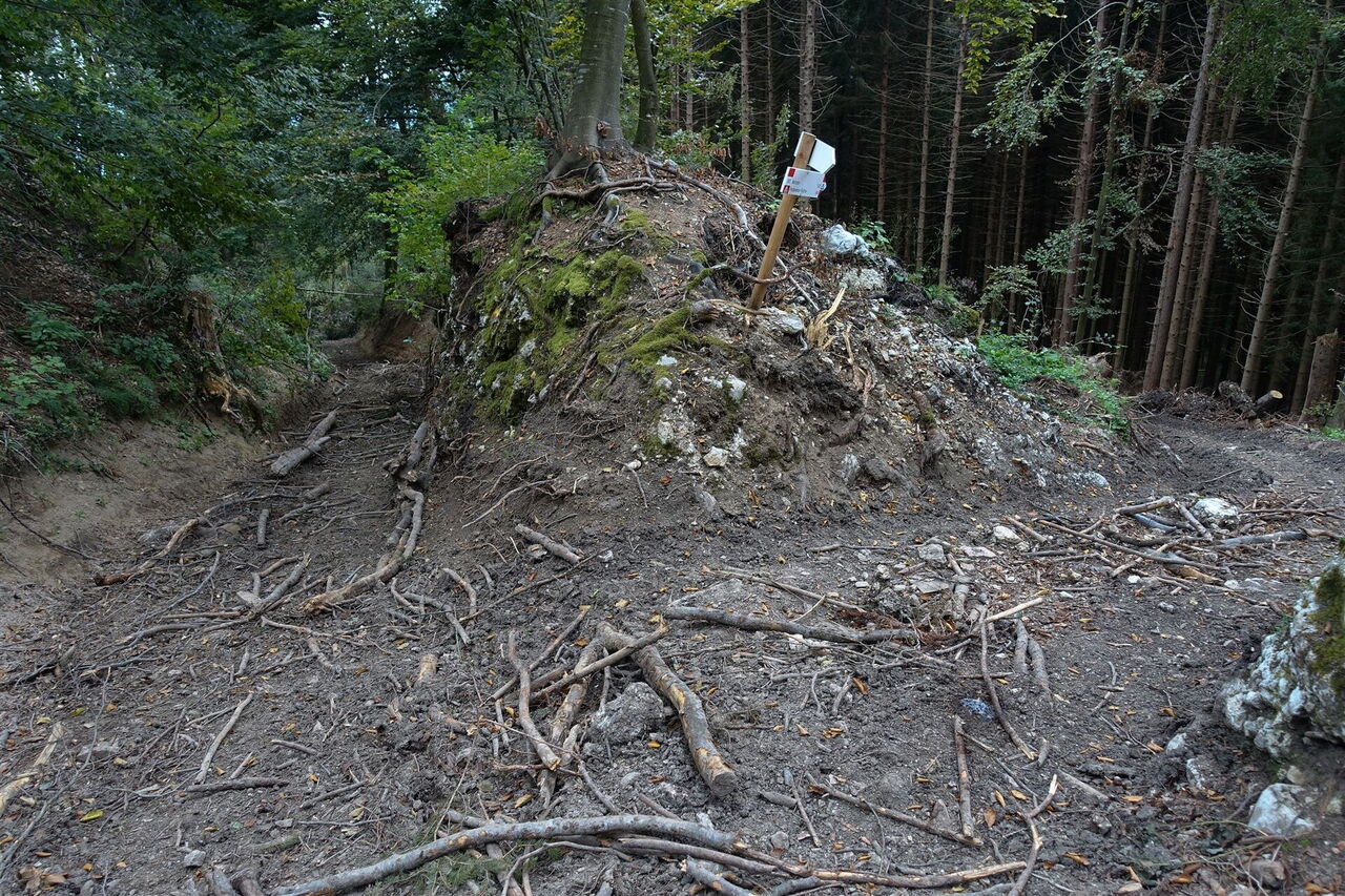 Wir gelangen an eine Weggabelung: Halb rechts führt der Wanderweg 801 (siehe auch Tourenbeschreibung 50) nach Pedavena Feltre, wir aber gehen bei diesem 02 Abzweiger (998 m) halb links und befinden uns nun auf der Variante 56 und im Anschluss auf der Variante 57. Dieser Wegabschnitt ist nicht ausgeschildert. Wir erreichen eine Wegekreuzung: Auf dem linken Arm befindet sich in 20 m Entfernung eine Ruine, wir gehen jedoch geradeaus weiter. Nach einigen Metern mündet von rechts ein Weg in den unsrigen und wir gehen wieder geradeaus weiter, bis wir dann dem halb links abzweigenden und gelb-rot markierten Pfad Sentiero Tematico folgen. Dieser kreuzt im weiteren Verlauf eine Piste.