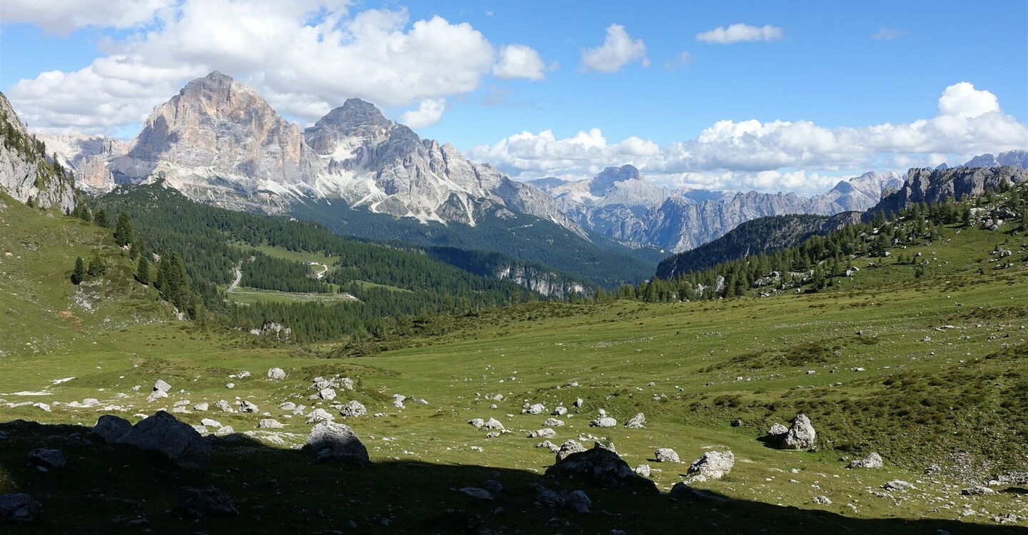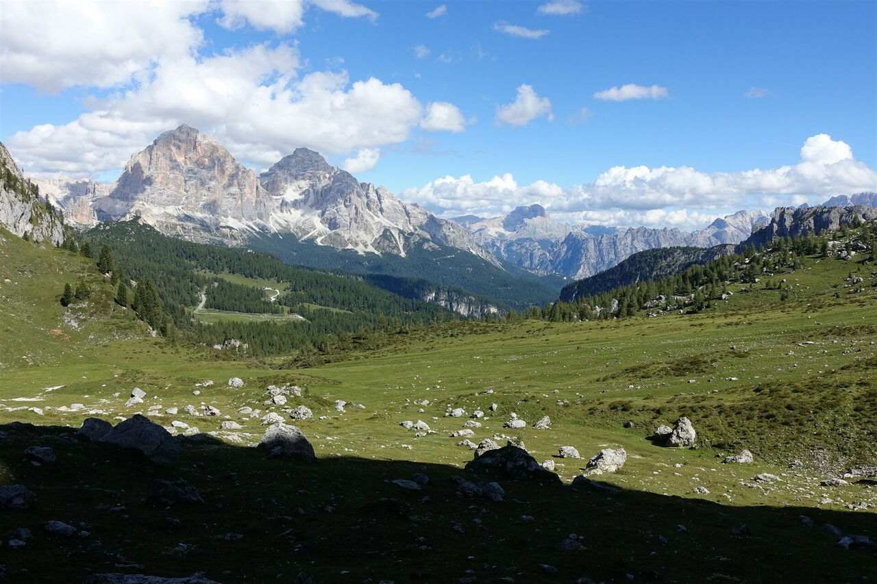 Den rechts abzweigenden Pfad zur Sennhütte Mondeval de Sora ignorieren wir. Die Hütte liegt in der Nähe des archäologischen Fundortes des Mannes von Mondeva, einem ca. 7.500 Jahre alten Jäger aus der Steinzeit – eine wichtige Entdeckung, die zusammen mit der 1991 entdeckten Gletschermumie Ötzi den Besuch der prähistorischen Menschen in den Alpen beweist. Nach kurzem Aufstieg erreichen wir die 03 Forcella Ambrizzola (2.227 m). Von links kommt der Wanderweg 434 vom Rifugio Croda da Lago (siehe Tour 10). Wir gehen rechts auf dem Wanderweg 436 weiter, auch ausgeschildert Richtung San Vito di Cadore. Unterhalb des Felsturms Becco di Mezzodì steigt der Pfad über Geröllfelder bis zur Forcella di Col Duro (2.302 m) auf. Von dort ergibt sich ein beeindruckender Blick auf den Monte Pelmo. Der Pfad ändert seine Richtung und führt nun nach Südosten und über Wiesengelände. Auf mehreren parallel verlaufenden Pfaden erreichen wir die Malga Prendera (2.184 m). Hier ignorieren wir den linken Abzweiger (Wanderweg 436) nach San Vito di Cadore und gehen auf der Schotterpiste geradeaus weiter, nun aber auf dem Wanderweg 458.