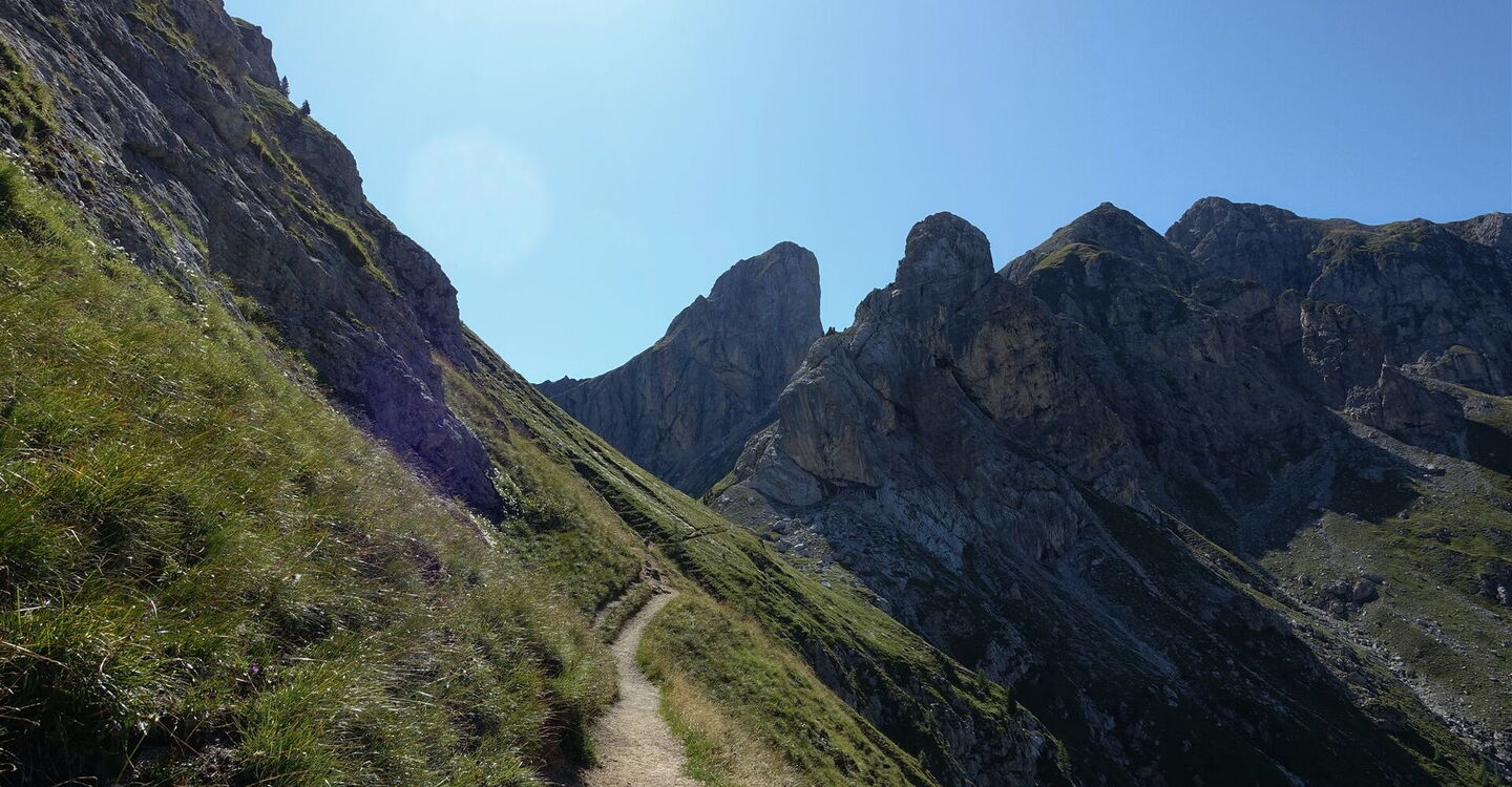 Unterhalb der kleinen Kapelle am 01 Passo di Giau (2.236 m) wandern wir in südöstlicher Richtung auf dem Wanderweg 467 Richtung Passo Staulanza/Wanderweg 436 Richtung Forcella di Giau. Schnell ist die Forcella di Zonia (2.229 m) erreicht, wo sich weitere Wegweiser befinden. Der nachfolgende Pfad führt durch steile Bergwiesen bis zur Forcella de Col Piombin (2.239 m). Von nun an geht es leicht bergab, durch das Reich der Murmeltiere, bis zu einer weiteren Wegkreuzung.