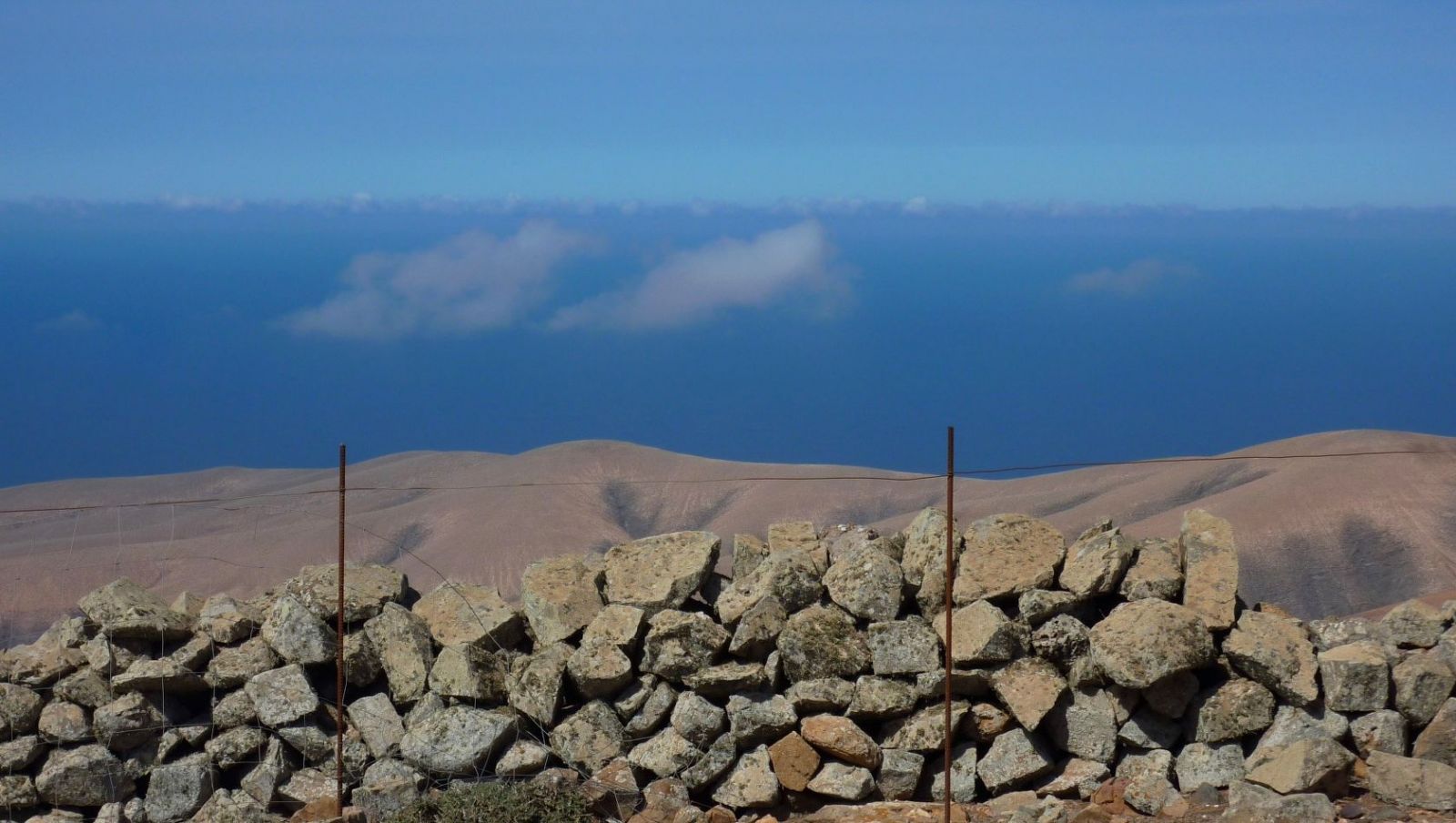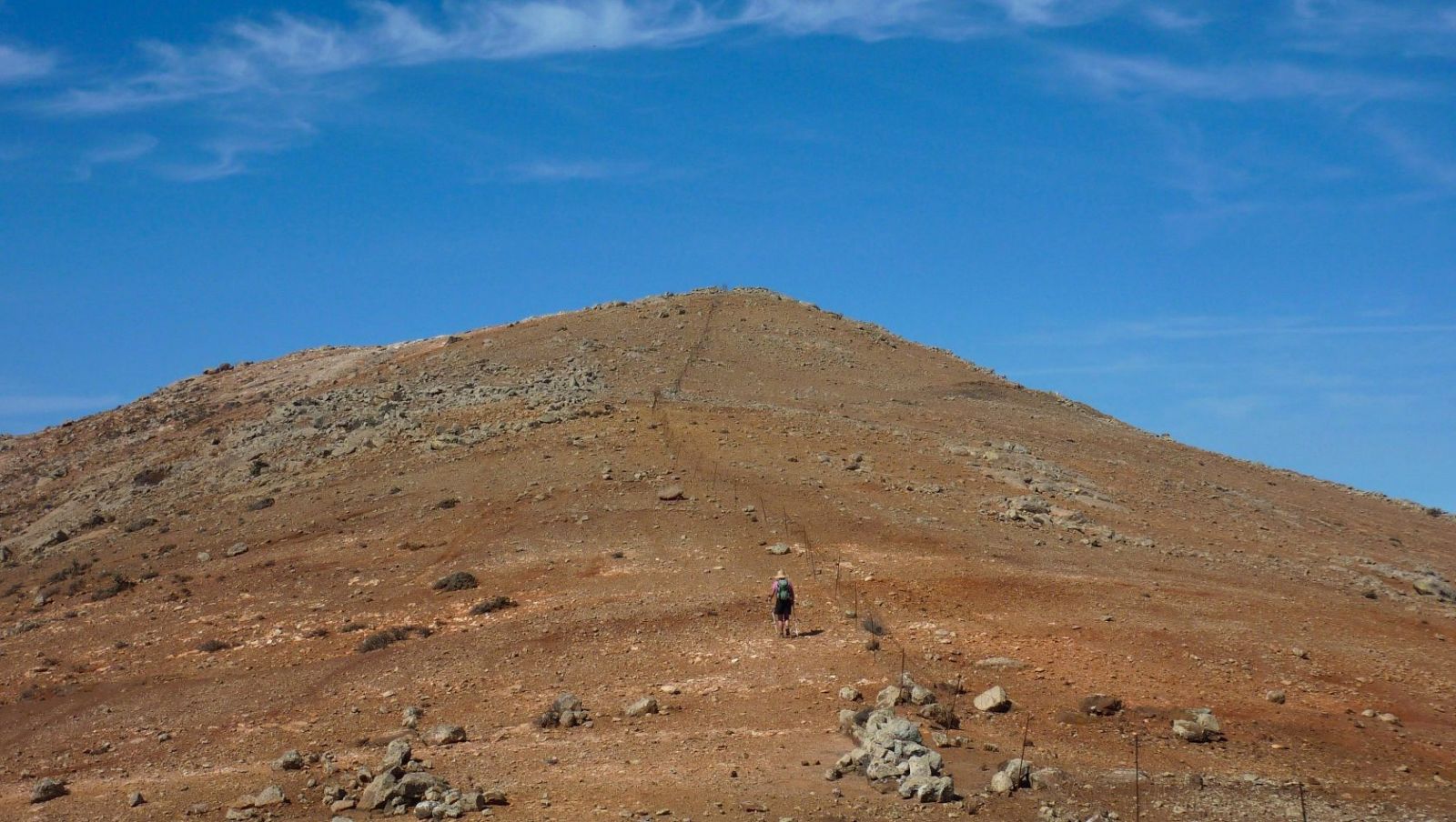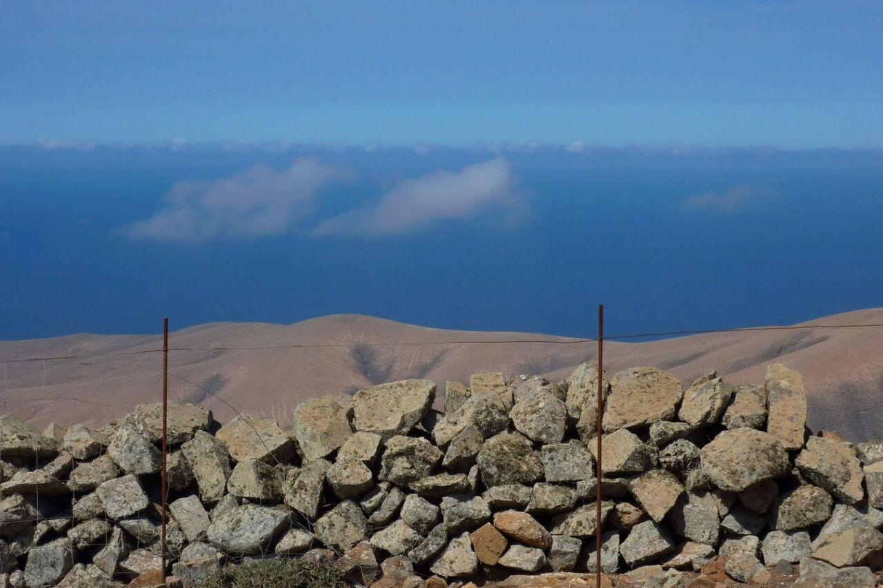 Auf dem mäßig ansteigenden Bergrücken erreichen wir auf leicht gerölligem Untergrund den (04) Pico de Betancuria (724 m). Wir haben es geschafft und genießen den imposanten 360°-Rundblick. Am Gipfel treffen drei Grundstückbegrenzungsmauern zusammen, hinter denen man bei einem stark wehenden Passatwind Schutz findet.
