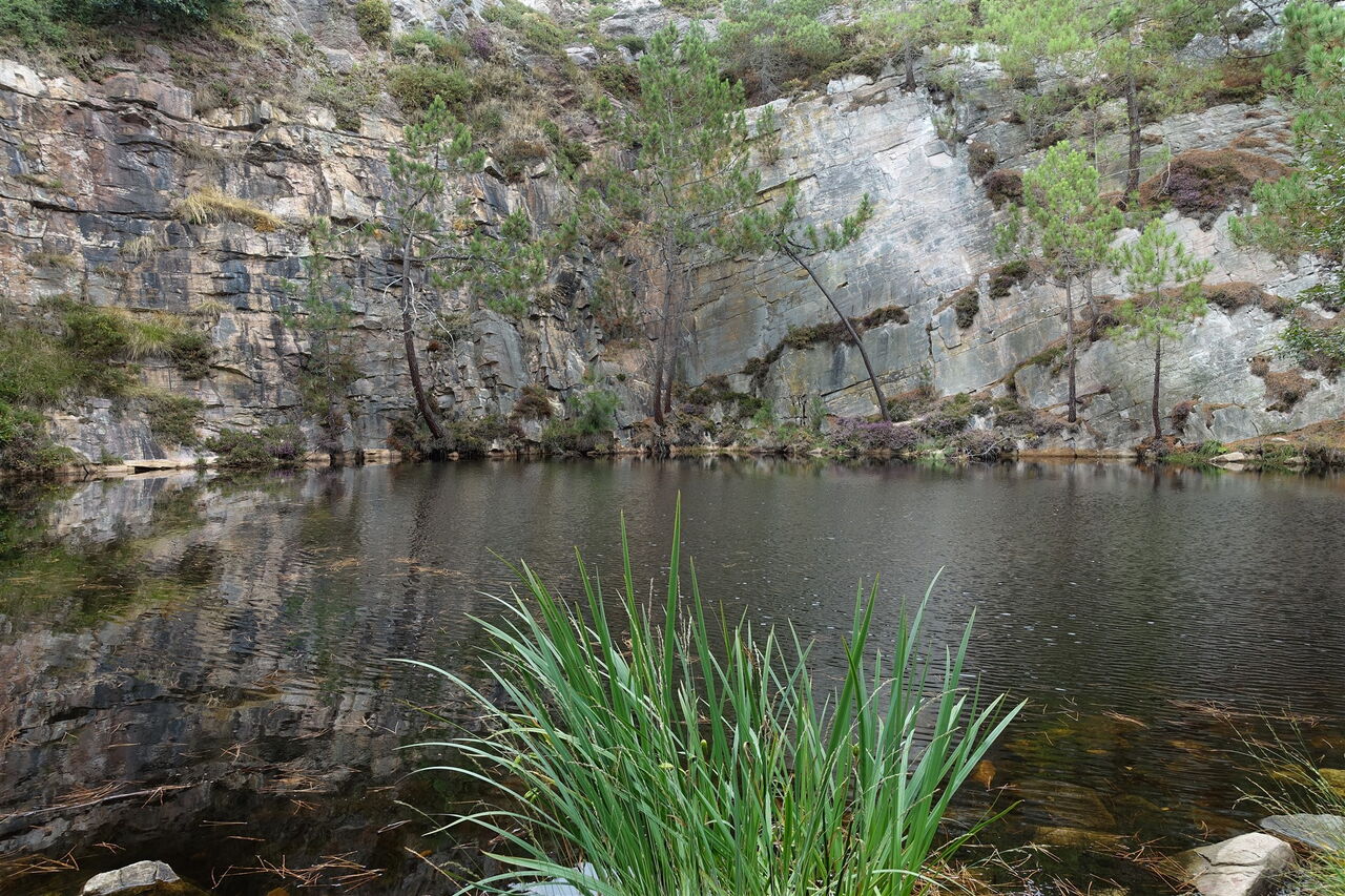 Wir wandern auf einem aussichtsreichen Pfad oberhalb des Hafenbeckens, linke Abzweiger ignorieren wir. Hinter einem kleinen See und einem Treppenaufstieg folgt der zweite der sogenannten 05 Lacs Bleus (48 m). Diese sind keine kreative Schöpfung der Natur, sondern Reste alter Steinbrüche aus rosafarbenem Sandstein, die malerisch von einem Pinienwald umgeben sind. Bis 1930 wurde hier Kopfsteinpflaster aus dem Fels geschnitten. Der Pfad mündet in eine Straße, auf der wir links gehen. Kurz später überqueren wir die Straße, um halb rechts an der Holzbarriere vorbei auf den nachfolgenden Weg zu gelangen. Bei im Weg liegenden Felsen endet der Weg, wir gehen rechts und erreichen die Straße. Auf dieser gehen wir geradeaus bis zum Parkplatz auf der rechten Seite.