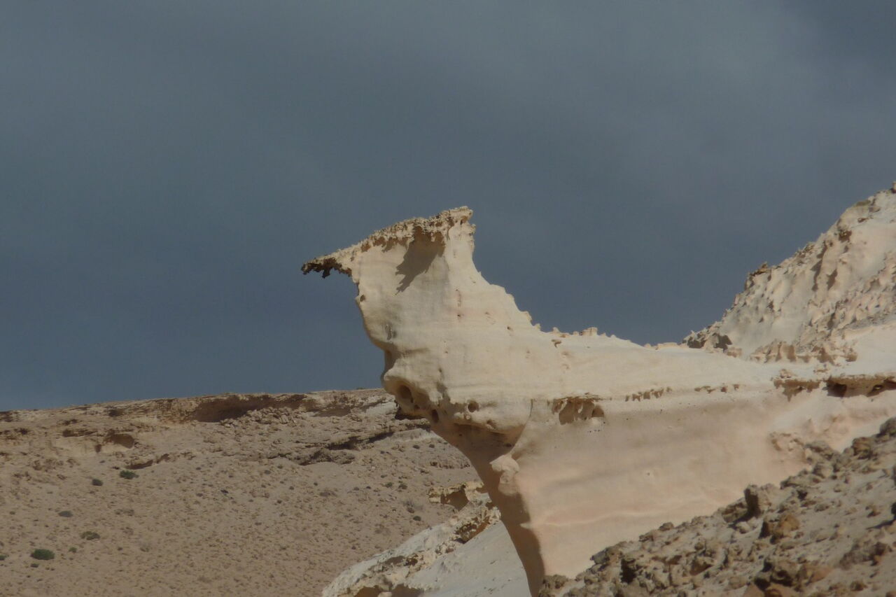 Wir treffen auf eine wilde Küstenlandschaft mit vom Wind geformten Sandsteinobjekten.