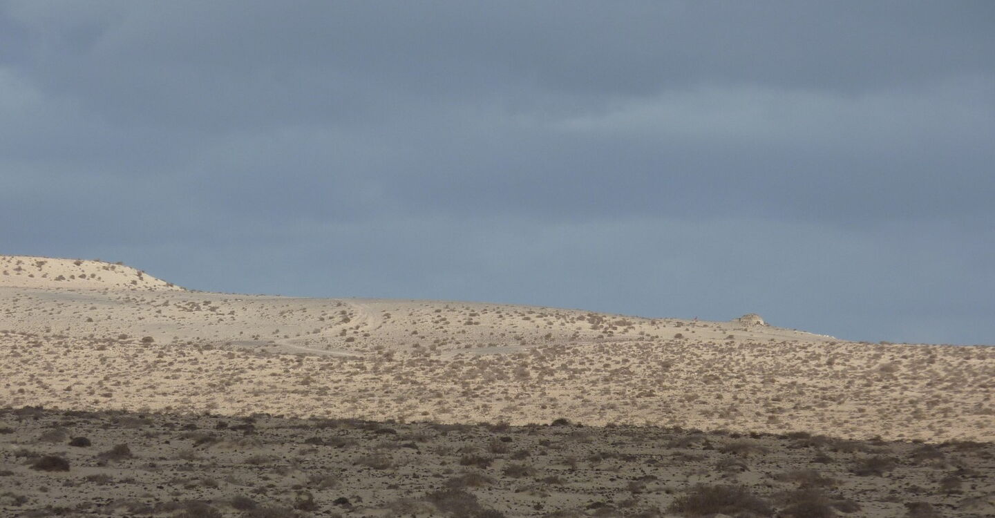 Wir starten die Wanderung in westlicher Richtung und gehen im 90°-Winkel zur Asphaltstraße, die auf den Hügel führt. Zuerst übersteigen wir weglos den vor uns liegenden Sandhügel. Schon bald können wir in der Ferne die Nordwestküste erblicken, die nach ca. 2,5 km Fußmarsch erreicht wird. Auf der Wanderung queren wir zahlreiche Pfade, die wir alle ignorieren. Da keine weiteren markanten Wegpunkte vorhanden sind, ist die Navigation nicht einfach. Wir steigen auf das untere Plateau direkt oberhalb des Meeresspiegels ab und gehen von dort aus links an der Küste entlang.