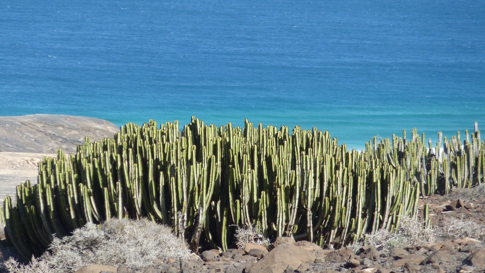 Von Parkplatz folgen wir der gut sichtbaren Schotterstraße direkt hinunter Richtung Meer. Den oberen Wegrand säumen Kakteen.