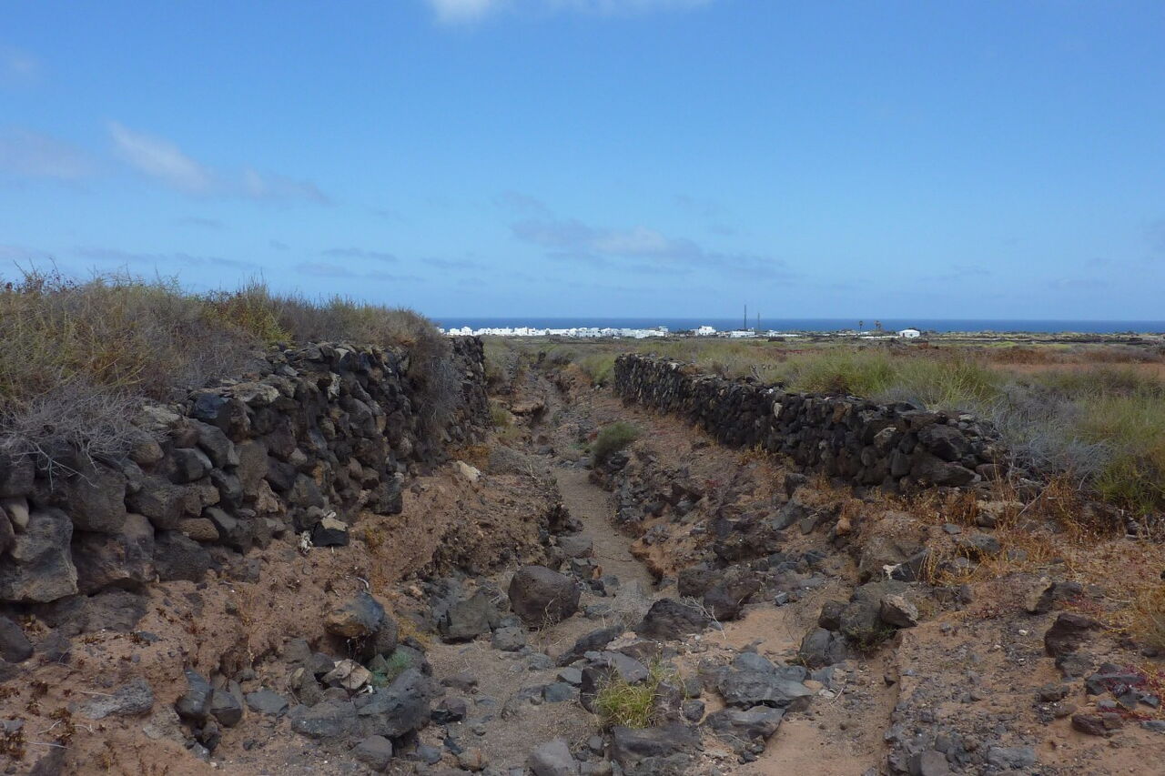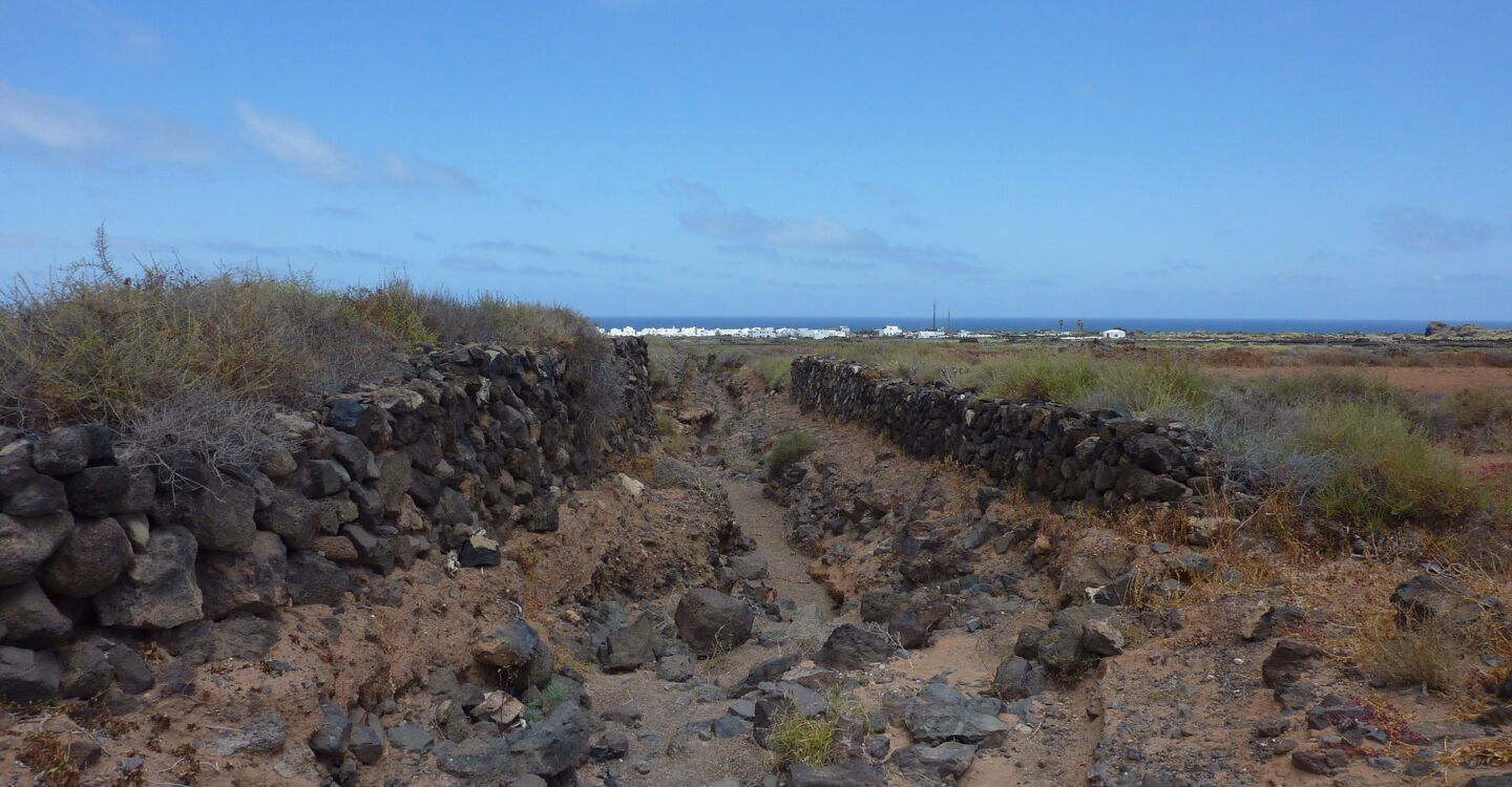 Wir sehen in 150 m Entfernung einen markanten Felsen, an dem wir links vorbeilaufen, um auf der folgenden Schotterpiste rechts zu gehen. Nach 50 m, bei einer Kreuzung, treffen wir auf die Reste eines (05) alten Handelsweges (48 m). Hier gehen wir links und erreichen nach 1,1 km Orzola und das verchromte Metallgeländer.