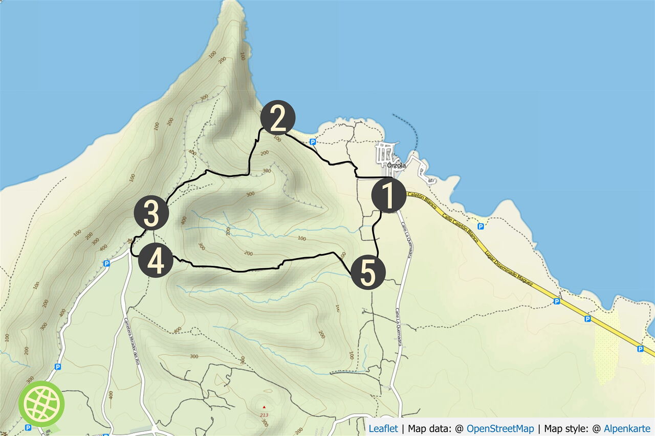 Von der (01) Bushaltestelle in Orzola (34 m) gehen wir bis zur LZ-204 vor und dort rechts in Richtung Hafen. Nach 120 m biegen wir bei einem Chromgeländer links in die Asphaltstraße ein, die schnell zur Schotterstraße wird. In einer Rechtskurve passieren wir ein Klärwerk. Schließlich verlassen wir den Hauptweg nach links auf einen Pfad, an dem zwei große Steine die Durchfahrt für Autos blockieren. Der Pfad quert den Hang oberhalb des Playa de la Canteria, bis wir nach einer scharfen Linkskurve vor einem großen Wasserfall stehen, den wir umgehen müssen.
