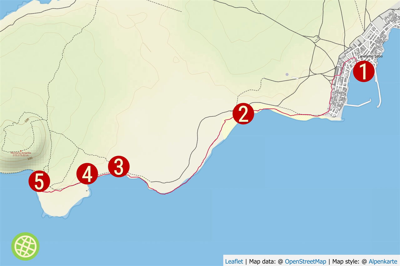 Haben wir uns entschieden, den Gipfel nicht zu besteigen, so lassen wir zwei Abzweiger nach rechts liegen und gehen nun bergab, direkt zum 05 Playa de La Cocina 1 m. Nach unserem Aufenthalt dort gehen wir auf dem gleichen Weg zurück zum Hafen.