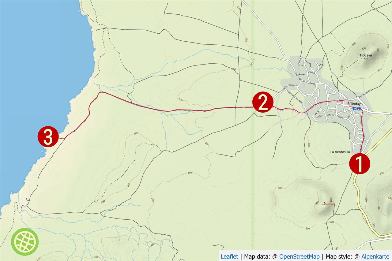 Der Start ist mit öffentlichen Verkehrsmitteln nicht erreichbar. Mit dem Pkw fährt man 18 km von Puerto del Rosario auf der FV-10 Richtung Tindaya, um dann bei der kleinen Verkehrsinsel links, gefolgt von einer Rechtskurve, in den Ort Tindaya zu fahren. Nach 1 km fahren wir bei der nächsten Verkehrsinsel links, vorbei an der rechts von uns liegenden Kirche. Bei der unscheinbaren Bar links auf der Ecke, links vorgelagert sind einige Parkplätze, fahren wir halb rechts weiter auf der Hauptstraße. Nach 150 m biegen wir vor der großen Verkehrsinsel in die Calle Los Reyes ein. Wir ignorieren alle Abzweiger links und rechts, bis die Straße endet. Hier fahren wir nur einige Meter links, um dann sofort rechts auf die beginnende Schotterpiste abzubiegen. Nach 3,3 km auf der Schotterpiste lassen wir den Abzweiger rechts zum Playa Tebeto liegen und fahren noch exakt 1,3 km, bis rechts ein unscheinbarer Schotterpfad abzweigt. Nach 200 m erreichen wir die Klippe direkt oberhalb des Strandabschnitts.