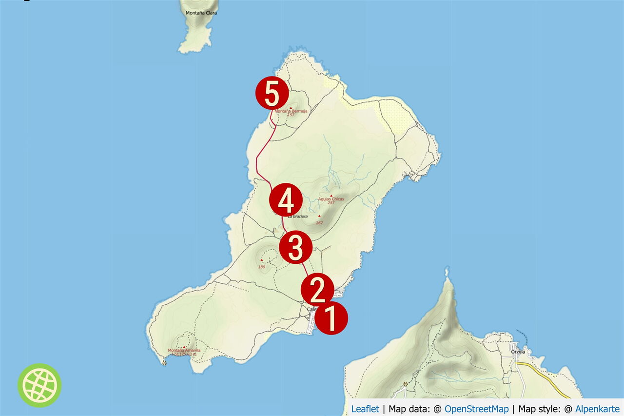 Lange Wanderung. An windstillen und somit heißen Tagen kann sie zu einer echten Herausforderung werden. Art des Weges: Der Weg führt über eine staubige Sandpiste. Zur Ausrüstung gehören auf jeden Fall ein Sonnenhut, Sonnencreme sowie Essen und Trinken für einen ganzen Tag. Einkehr: Es gibt keine Einkehrmöglichkeiten auf der Wanderung, aber dafür einige an der Hafenmole. Diese Tour kann man zu jeder Jahreszeit unternehmen. Tipp: Wer nur für einen Tagesflugausflug auf La Graciosa ist, sollte die Abfahrtszeiten der Nachmittagsfähren im Auge behalten.