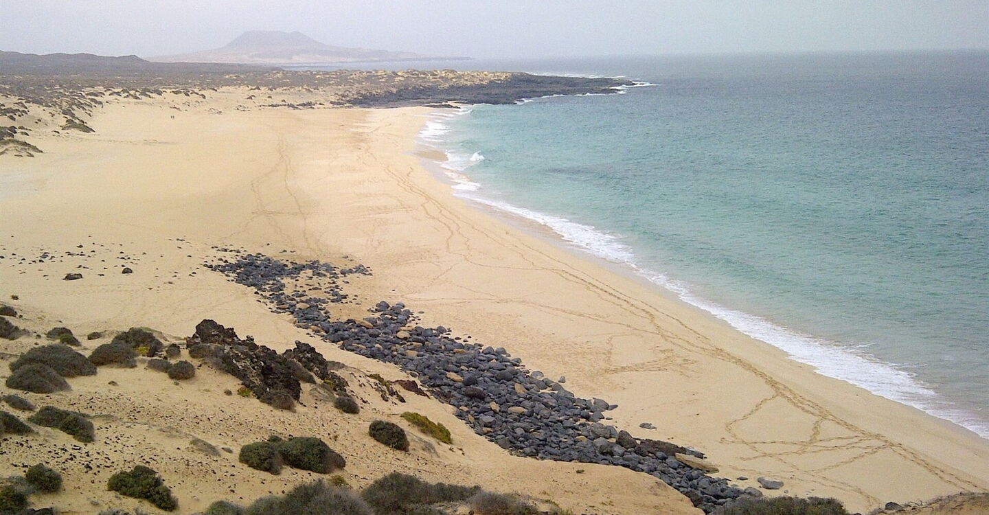 Nach 5 km Wegstrecke lassen wir den rechten Abzweig liegen und gehen nun direkt auf den Vulkan, die Montaña Bermeja mit 157 m, zu. Nur kurz später treffen wir auf einen Wendeplatz für Fahrzeuge, links führt der Weg durch eine Dünenlandschaft an den sehr schönen 05 Playa de las Conchas 0 m. Wir gehen den gleichen Weg zum Ausgangspunkt zurück.