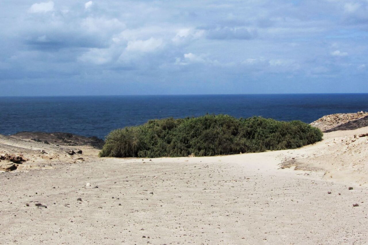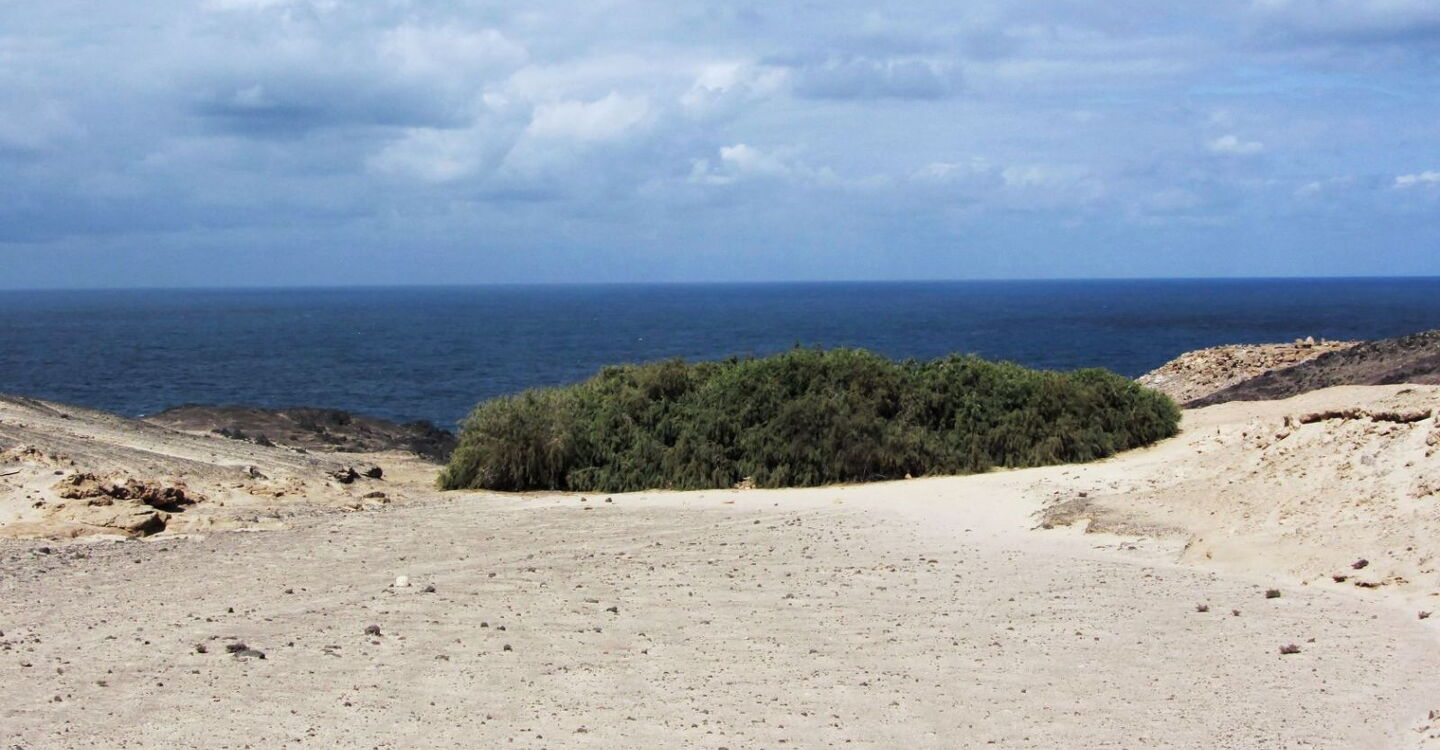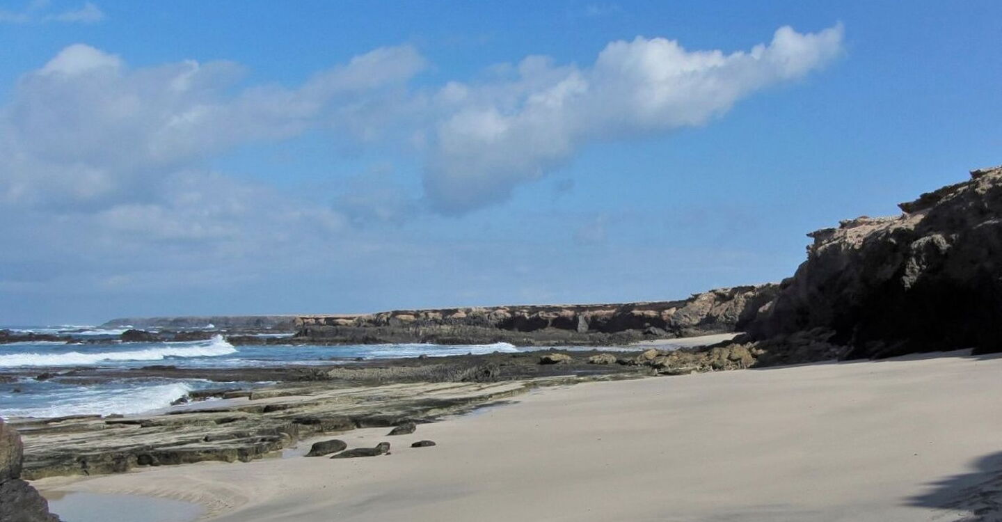 Diese Wanderung für Entdecker hat ihren Ausgangspunkt im Nichts, auf einer weiten kargen Ebene. Sie führt uns entlang des südlichsten Vulkans von Fuerteventura zu einem kleinen Tamariskenwald. Bei der nachfolgenden Bucht, der Caleta de la Madera, blickt man entlang der bizarren Felsküste. Vorbei führt der Wanderweg am kleinsten Leuchtturm von Europa bei der Punta Pesebre bis zum Ausgangspunkt, dem Playa de Ojos. Bereits auf der Pkw-Rückfahrt sollte man auf jeden Fall in dem kleinen Fischerdorf Puerto de la Cruz in der Bar Tenderete einkehren. Der vom Wirt frisch gefangene Fisch wird in einem riesigen Topf serviert. Als Beilagen werden Zwiebeln, Gofio und Weißbrot gereicht. Hier gibt es die beste und ursprünglichste Fischsuppe von Fuerteventura.