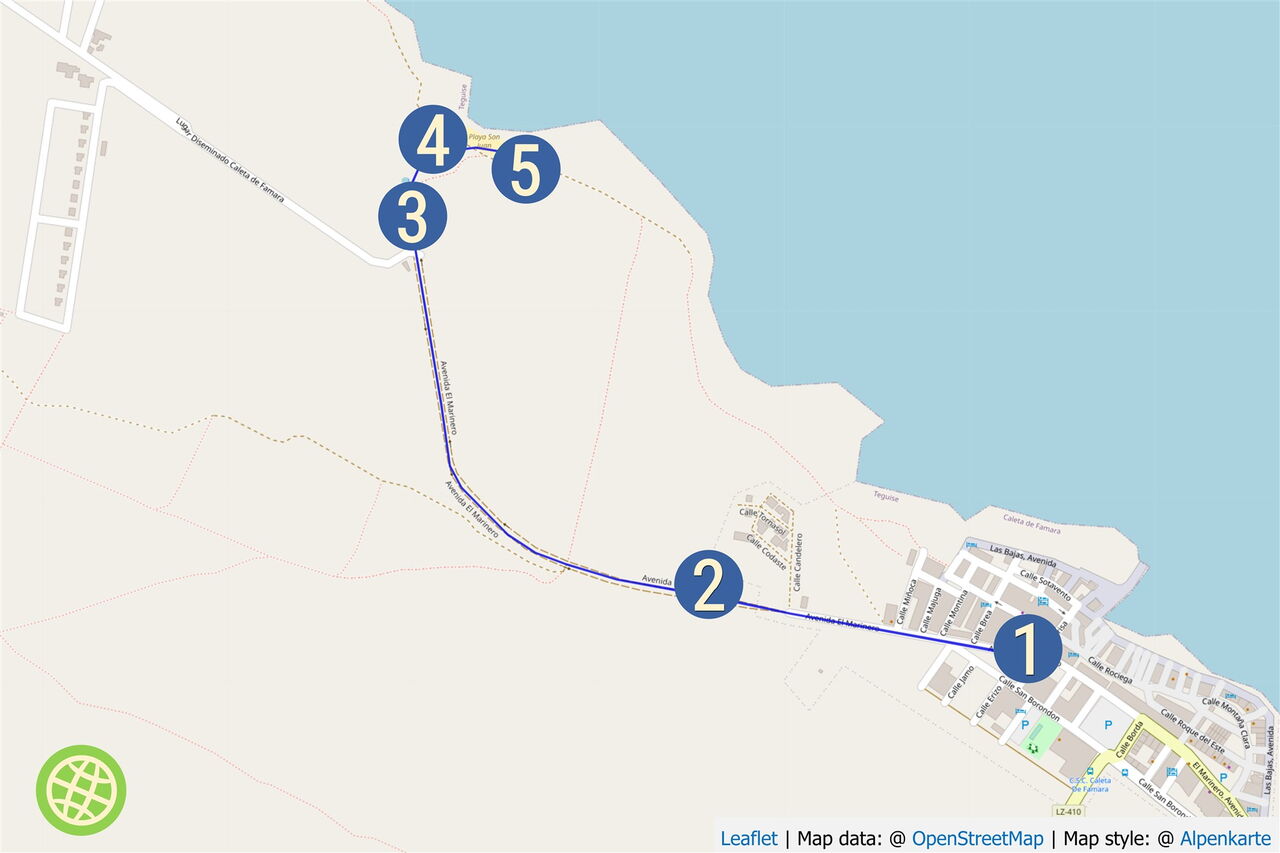 Die Buslinie 20 verbindet Arrecife mit dem Ort Caleta de Famara. Mit dem Pkw sind es von Arrecife über die LZ-20 und LZ-30 24 km nach Caleta de Famara. GPS-Koordinaten 29.124867 -13.576467.