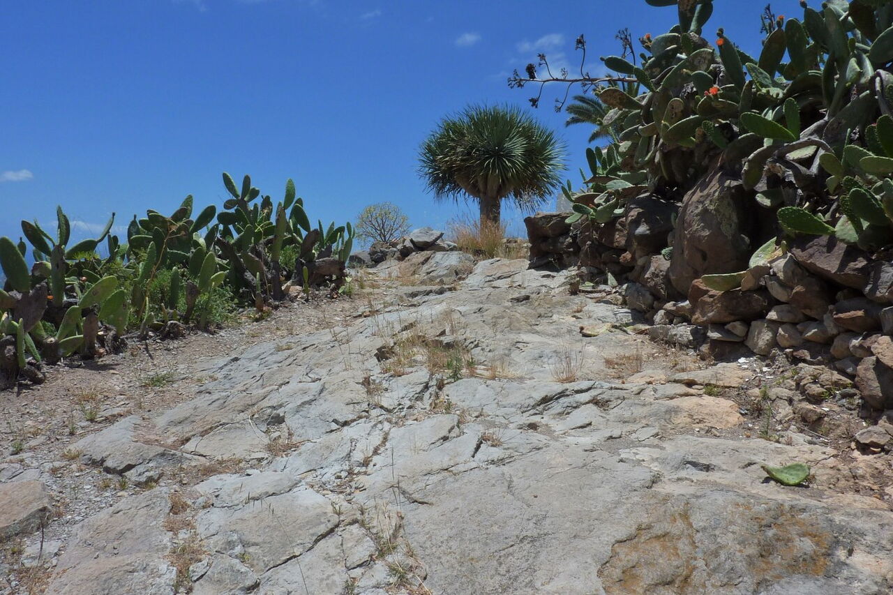 In gemütlichen langen Kehren gewinnen wir kontinuierlich an Höhe. Sobald wir Palmen erreichen - die Piste macht an dieser Stelle eine scharfe Rechtskurve -, folgen wir dem Camino Richtung Targa. Wir treffen auf den (03) Roque de los Moros (742 m). Von Süden ist die Besteigung nicht einfach. Daher gehen wir weitere 70 m unterhalb des eingezäunten Grundstücks und folgen an der folgenden Wegkreuzung dem Abzweiger nach rechts, Richtung Targa. Nach weiteren 70 m entlang einer 5 m hohen Felswand verlassen wir den Camino nach rechts, steigen über die Terrassenfelder weglos auf und erreichen eine Asphaltstraße, die zu dem Grundstück geführt, welches wir gerade umlaufen hatten. An der Asphaltstraße gehen wir links, bis sie endet. Dort gehen wir rechts direkt auf den Roque zu, der von dieser Seite einfach zu erklimmen ist.