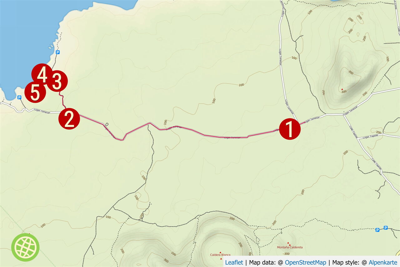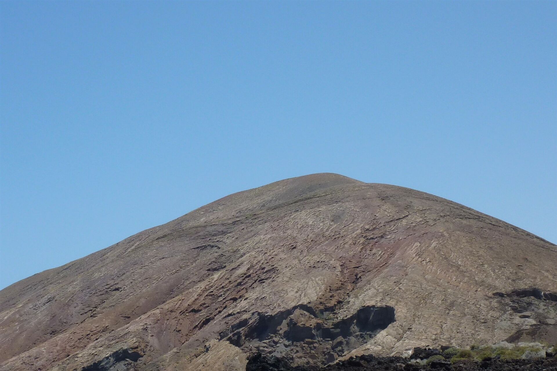 Auf dem folgenden Wegstück versagen die meisten Navigationsgeräte. Zur Orientierung: Direkt hinter uns liegt die markant aussehende, hellbraune Montaña de Teneza. Die Straße rechts, die Richtung Tenesar führt, lassen wir liegen und fahren auf der Schotterstraße geradeaus weiter. Ab hier, vom 01 Start und Ziel 149 m, führt die Strecke nun exakt 2,7 km durch die Lavafelder. Links von der Straße sieht man die Caldera Blanco mit ihrem 1 km großen Vulkandurchmesser. Wir lassen die Schotterpiste links Richtung Caldera Blanco liegen und fahren geradeaus weiter.