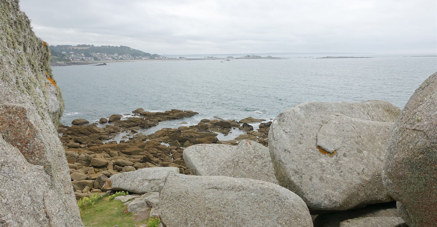 Links oberhalb des Strandes befindet sich der weiterführende Pfad, exotisch anmutende Eukalyptusbäume säumen den Weg. Wir erreichen die 04 Pointe du Dourven (14 m). An dieser Stelle befand sich einst ein Wachposten, das verbliebene Wachhaus aus dem 18. Jahrhundert erinnert an die militärische Vergangenheit. Von diesem besonderen Aussichtspunkt blickt man Richtung Osten auf die Mündung des Flusses Léguer und die Strände von Beg Léguer, Richtung Norden in den Ärmelkanal und nach Westen über gewaltige Felsen bis zur Landzunge Pointe de Séhar und zum Plage de Notigou – unser nächster Wegpunkt.