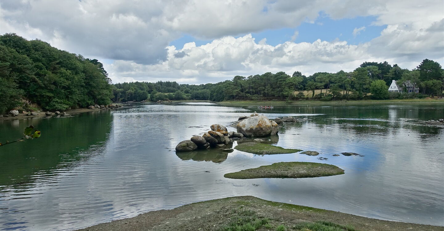 An der nachfolgenden Pfadgabelung gehen wir halb rechts, bei der darauffolgenden Gabelung halb links und wir überqueren eine kleine Holzbrücke. Große, ja riesige mit Moos bedeckte und rund geschliffene Felsen säumen den nachfolgenden Wanderweg, der an einer Straße endet. Auf der Route de Kerdruc gehen wir bis zur nachfolgenden Verkehrsinsel. Geht man dort geradeaus weiter, so gelangt man zum vorzüglichen Restaurant Le Bistrot de l'Écailler. Sonst gehen wir in die rechte der beiden Seitenstraßen – auch ausgeschildert Richtung Port Manec`h. Wir halten uns vor einem Steinhaus halb links, vor einem Haus mit einer Kieseinfahrt links und bei der nächsten Möglichkeit rechts, nun befinden wir uns auf einem Feldweg. Es folgt einer der landschaftlich schönsten Abschnitte der Wanderung entlang des Nebenarmes 04 Anse de Poulguin (8 m) mit vielen Wegverzweigungen: Wir queren eine Brücke über einen Bachlauf, ignorieren den rechten Abzweiger Richtung Kerochet und überqueren eine kleine Brücke. Bei einem hölzernen Markierungspfeiler kürzen wir die Strecke nach rechts ab. Der schmale Pfad endet und wir gehen links auf einem breiteren Pfad bis zu einer kleinen Brücke und einem riesigen Felsen. Weiter geht es wie folgt: Wir umlaufen die verschlungenen Ausläufer des Nebenarms des Flusses bis zu einer Fischerhütte, gefolgt von einer Zufahrtsstraße. Hinter einem Mauerdurchlass gehen wir rechts auf dem weiß-rot ausgekreuzten Pfad weiter. Bei einer hohen Mauer queren wir die Schotterpiste, gehen auf dem weiterführenden Pfad und kommen an einem Steinkreuz vorbei.