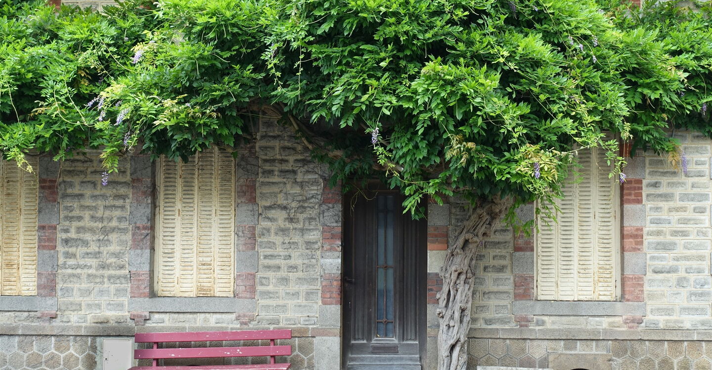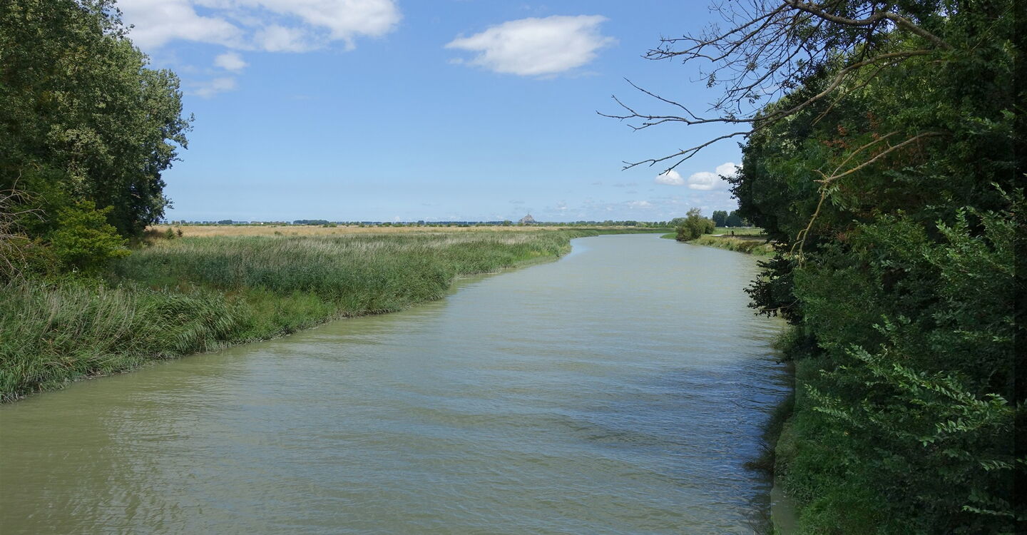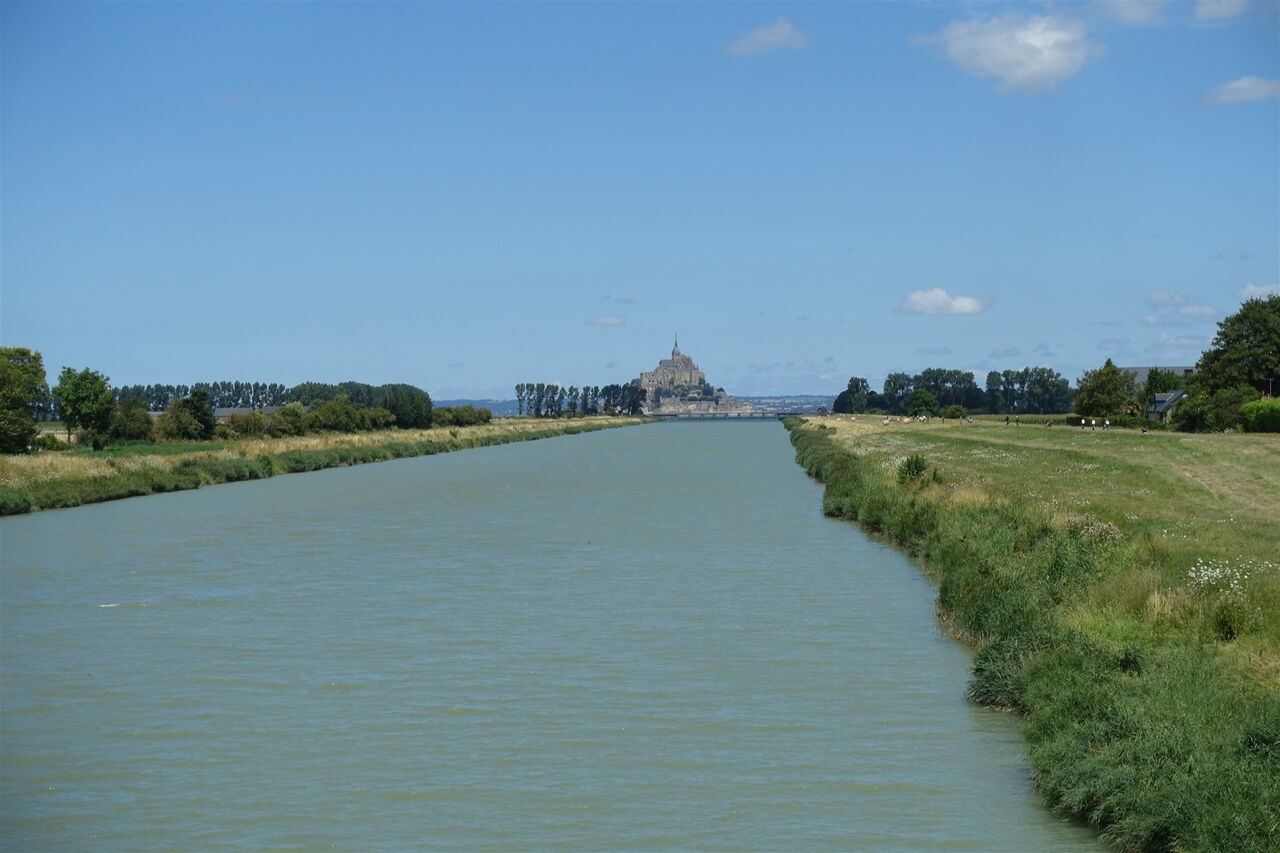 Bei dem ersten Kreisverkehr mit dem Springbrunnen gehen wir fortan auf der rechten Uferseite des Flusslaufes des Couesnon, auch ausgeschildert Richtung Le Mont-Saint-Michel. Es geht durch einen angelegten Garten mit exotischen Bäumen und vorbei an prachtvollen Villen. Die Wegführung ist immer eindeutig. Im weiteren Verlauf unterqueren wir die Bundesstraße und gelangen zur 02 ersten Brücke (1 m). In der Ferne kann man bereits die Kirchturmspitze der Abtei sehen.