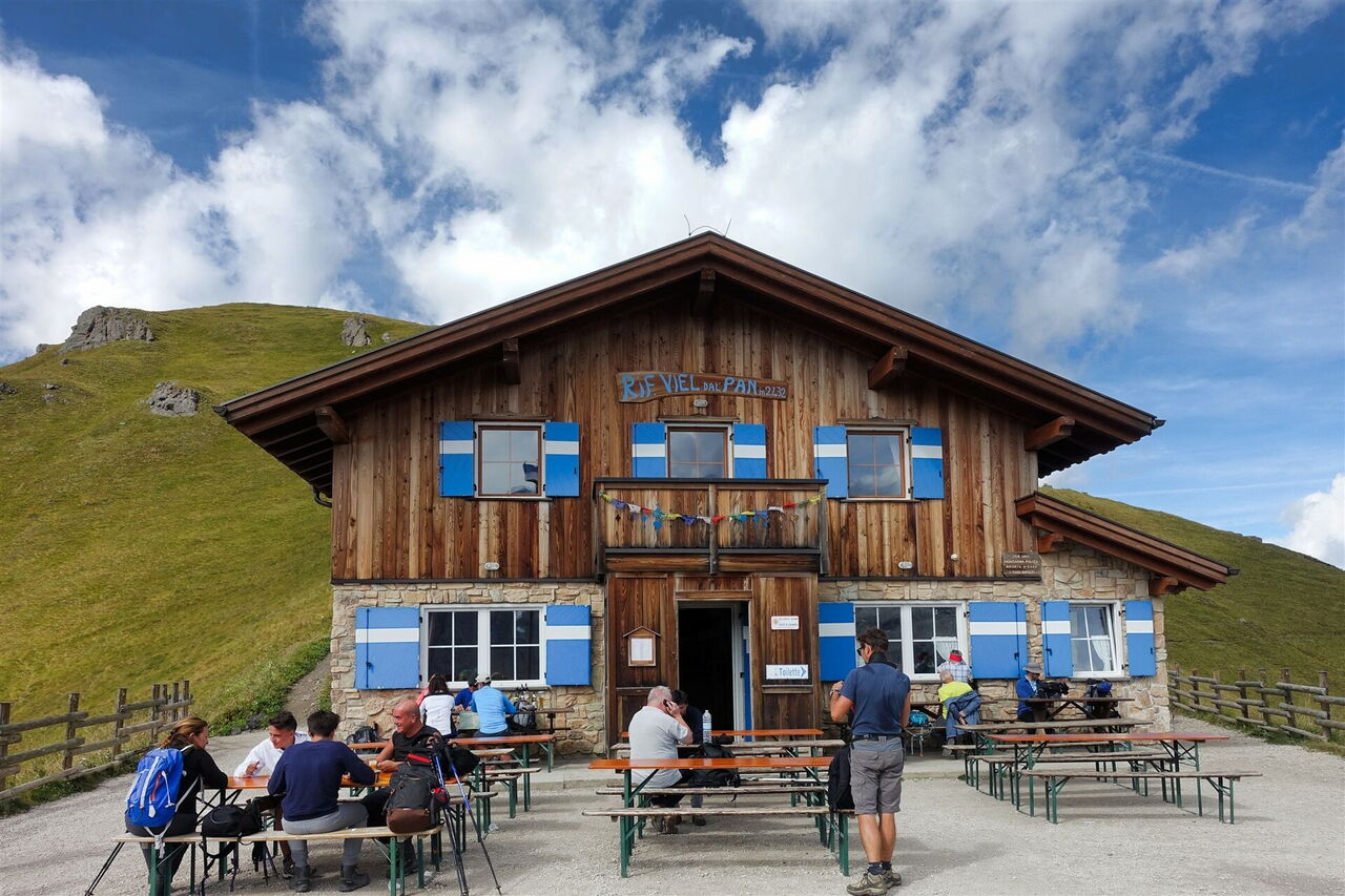Es folgt ein aussichtsreicher Höhenweg mit faszinierender Fernsicht auf das Bergmassiv der Marmolata. Auf halber Strecke der heutigen Etappe erreichen wir die nächste Hütte, das 03 Rifugio Viél dal Pan (2.432 m).
