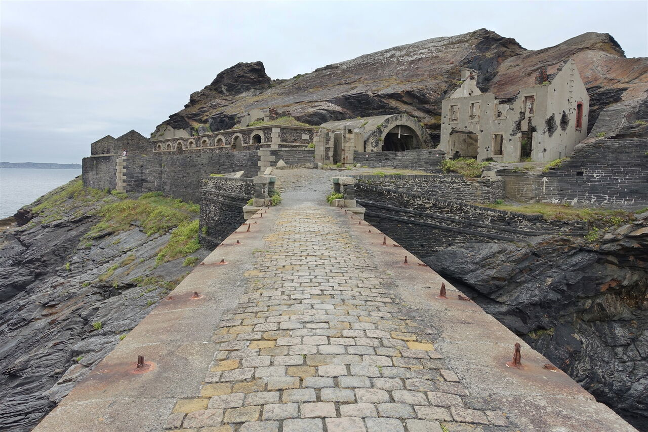 Bei einem schönen Aussichtspunkt auf das Meer gehen wir halb rechts und sehen bald unterhalb das 1848 auf der Îlot des Capucins gebaute 02 Fort des Capucins (19 m). Der Abstieg ist steil und geröllig, bei feuchter Witterung zudem sehr rutschig. Die aus Schiefer gebaute Festung integriert sich perfekt in die Felslandschaft, man geht davon aus, dass der gesamte Felsen ausgehöhlt ist. Nach einer Erkundungstour durch die gespenstisch anmutenden Ruinen beginnen wir wieder mit dem Aufstieg und gehen bis zu der Weggabelung mit dem Bunker auf dem bekannten Weg zurück. Dieses Mal lassen wir den Bunker auf der linken Seite liegen. Die Natur hat sich inzwischen ihren Raum zurückgeholt, weitere Befestigungsanlagen am Wegesrand sind kaum noch zu erkennen. Wir tangieren die Hauptstraße und erreichen das Fort de Kerviniou, eine neuere Anlage aus dem 19. und 20. Jahrhundert. Am Ende einer hohen Steinmauer kann man auf einem Pfad bis zur Landspitze heruntergehen.