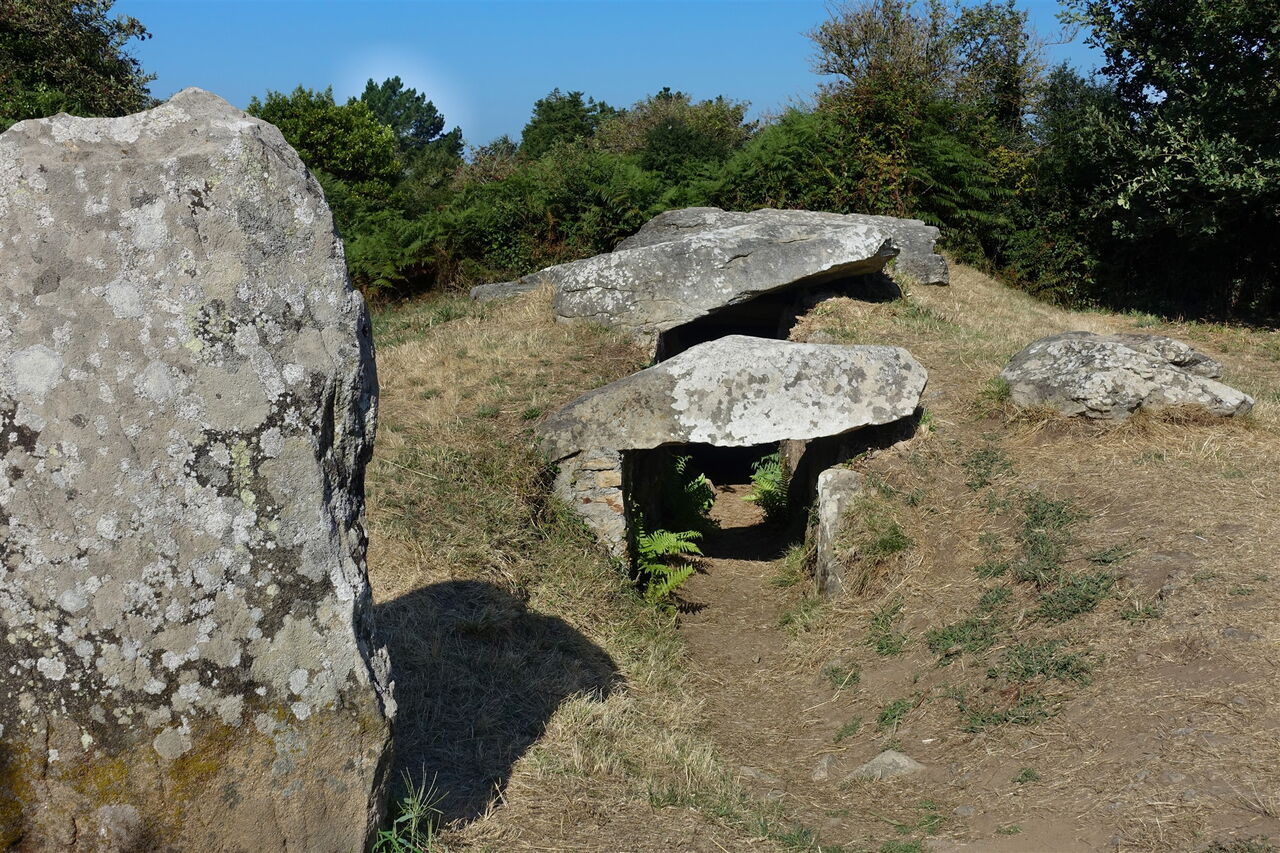 Sobald wir eine Asphaltstraße erreichen, befindet sich rechts nach 125 m der 05 Dolmen de Lannek-er-Men (21 m). Dolmen ist in Frankreich der Oberbegriff für Megalithanlagen aller Art. Der kleine von Osten nach Westen orientierte, 4 m lange und 1,5 m breite Dolmen mit einem Zugang im Osten besteht aus zwölf Steinen, von denen sechs seitliche die beiden Decksteine stützen und ein Stein neben der Anlage liegt. Wir gehen die 125 m zurück und an der Kreuzung geradeaus, links befindet sich der Hinweg. Bei der weithin sichtbaren Kirche befindet sich der Parkplatz.