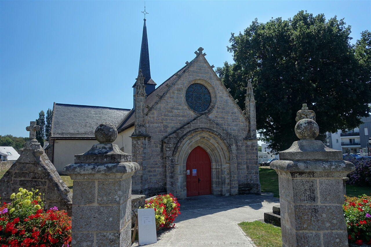 Nach vielen prachtvollen Villen erreichen wir die 1494 fertiggestellte 02 Chapelle Notre Dame du Loc (33 m). Die Kapelle ist ein schönes Beispiel für die extravagante gotische Architektur. Im Inneren befindet sich ein Chorkreuz aus mehrfarbigem Holz, eine äußerst seltene Arbeit. Der Kalvarienberg zeigt die Kreuzigung auf der einen Seite und eine Madonna mit Kind auf der anderen Seite. Wir gehen über den großen Parkplatz rechts neben der Kirche und an dessen Ende folgen wir dem Pfad, der zum etwas unterhalb liegenden Kreisverkehr führt. Auf der rechten Seite, direkt vor dem Kreisverkehr, biegen wir rechts auf einen Pfad ab und folgen dem Bach Lihuanteu durch ein Feuchtgebiet.
