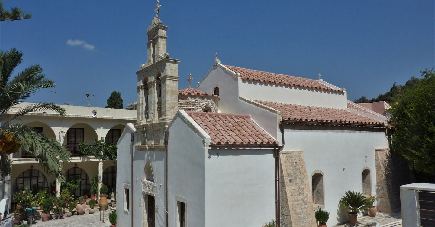 Nach 300 m, vor einem runden Wassertank, kürzen wir abermals über die Piste nach rechts ab. Weitere 280 m gehen wir durch die Talsohle und biegen bei der großen Kiefer links ab, gehen sofort wieder rechts und nun für 800 m leicht bergauf, bis unsere Piste in eine weitere mündet. Kurz später mündet von links eine Piste in unserer Hauptpiste. Wir kommen an einer kleinen Kirche vorbei und erreichen den Parkplatz des 03 Paliani Convent (339 m), das älteste Nonnenkloster auf Kreta. Nach der Besichtigung gehen wir auf der Hauptstraße weiter und sehen im Tal rechts die Ruinen des Tempels Oktarsissa. Ein lohnenswerter Abstecher. Es geht nun weiter bergab bis auf die Höhe einer riesigen Platane – in 50 m Entfernung befindet sich ein Brunnen. Hier gehen wir links hoch und bis zur Hauptstraße vor, um dort 300 m rechts bis zur Kreuzung vorzugehen.