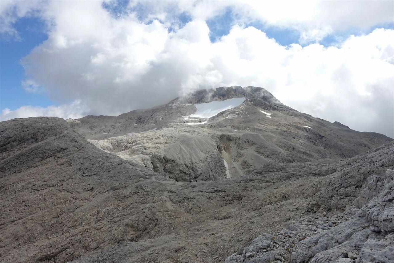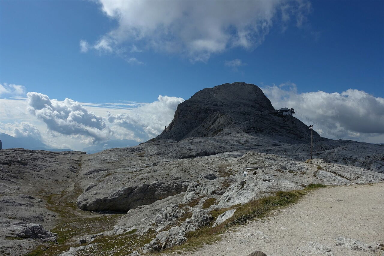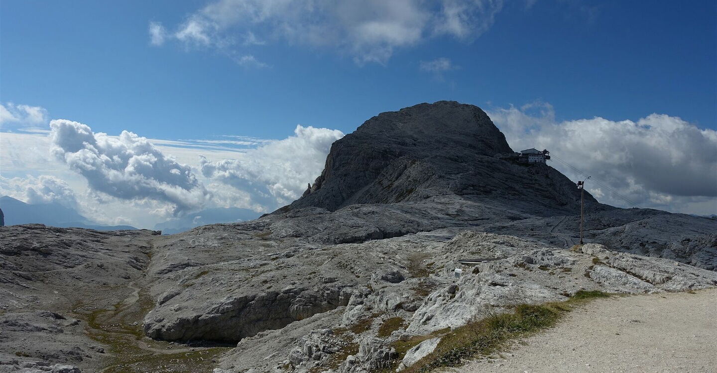 Von dem 01 Rifugio di Rosetta (2.581 m) entfernen wir uns in östliche Richtung auf dem breiten Wanderweg. Den sofort folgenden linken Abzweiger zum Rifugio Mulaz (siehe Tour 42) ignorieren wir und bei dem nachfolgenden Wegweiser folgen wir halb rechts dem abzweigenden Wanderweg 709 zum Passo di Pradidali Basso. Ein Pfad ist auf der karstigen Palahochfläche nur schwer auszumachen. Steinmännchen und weiß-rote Markierungen helfen bei der Orientierung, die bei schlechter Sicht umso schwieriger wird.
