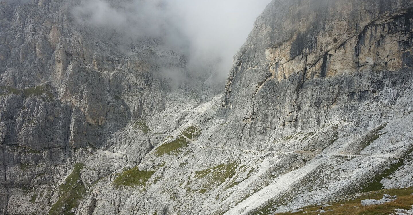 Sobald die steilen Felswände links von uns in ein Felsband – teils Schuttband – übergehen, führt der Pfad durch dieses hindurch, nun in östliche Richtung. Wir erreichen einen rechten 03 Abzweiger (2.285 m), den Abstieg mit der Wegnummer 702 nach San Martino di Catrozza. Wir gehen aber geradeaus weiter, nun auf dem Wanderweg 715. Auf einem kleinen Plateau queren wir mit Gras bewachsene Wiesen, bis wir dann einen ca. 200 m langen und mit Stahlseilen gesicherten Wegabschnitt erreichen. Dieser führt größtenteils entlang eines schmalen Felsbands. Der nicht schwindelfreie und trittsichere Wanderer legt nun das Klettersteigset an.